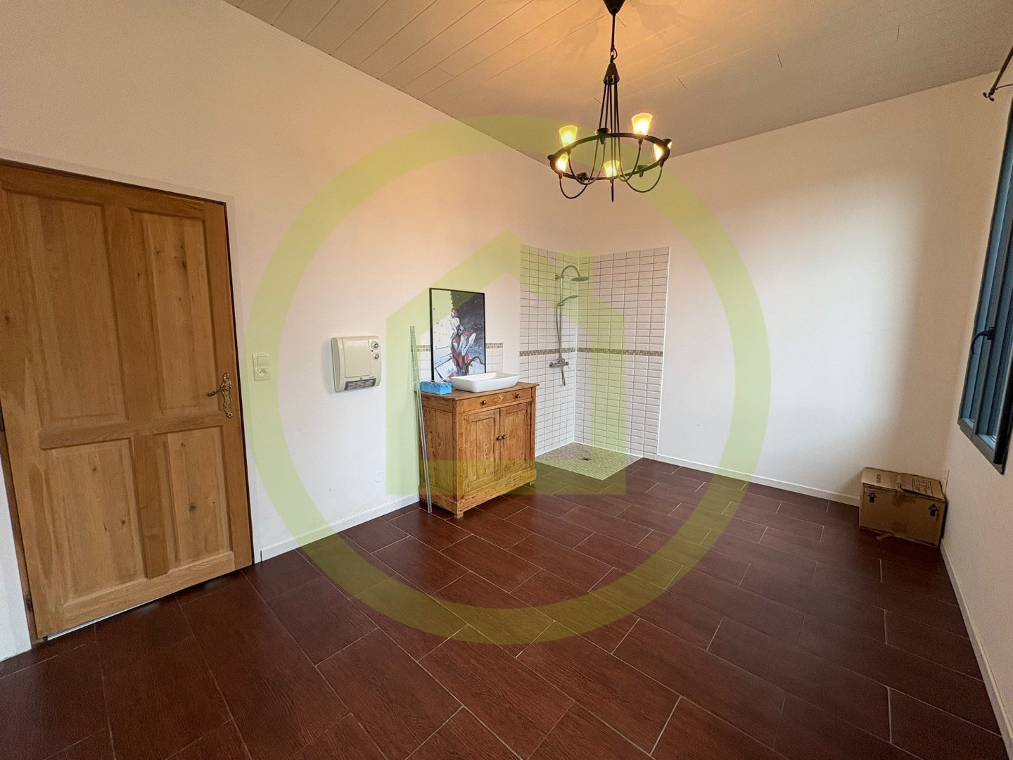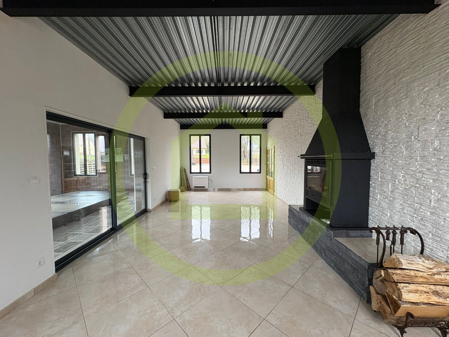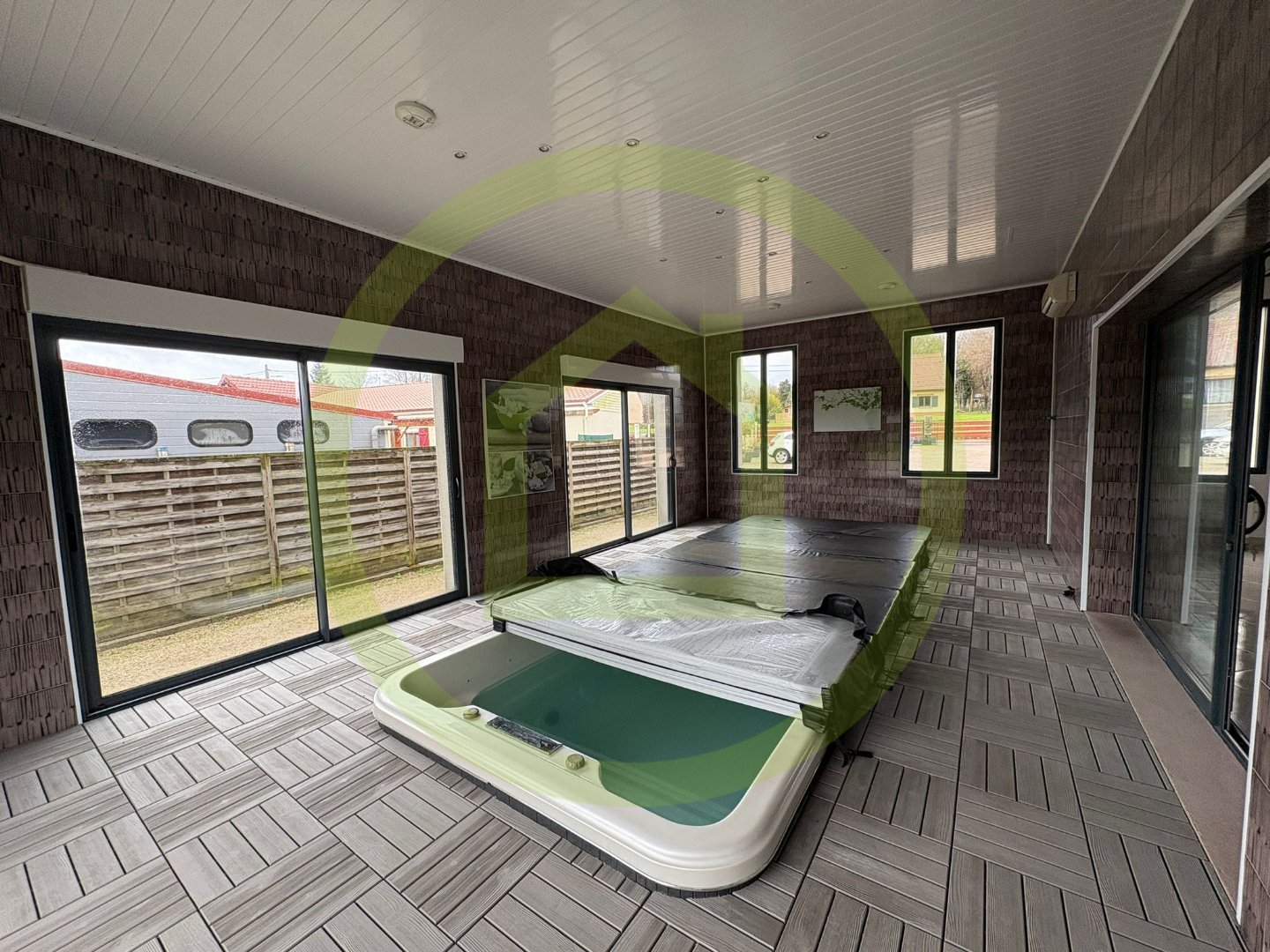 Après l'entrée, vous aurez un salon esprit industriel avec de la hauteur qui vous amènera sur cet espace couvert aménagé avec SPA de nage pour contenter les sportifs ou les amateurs de détente.