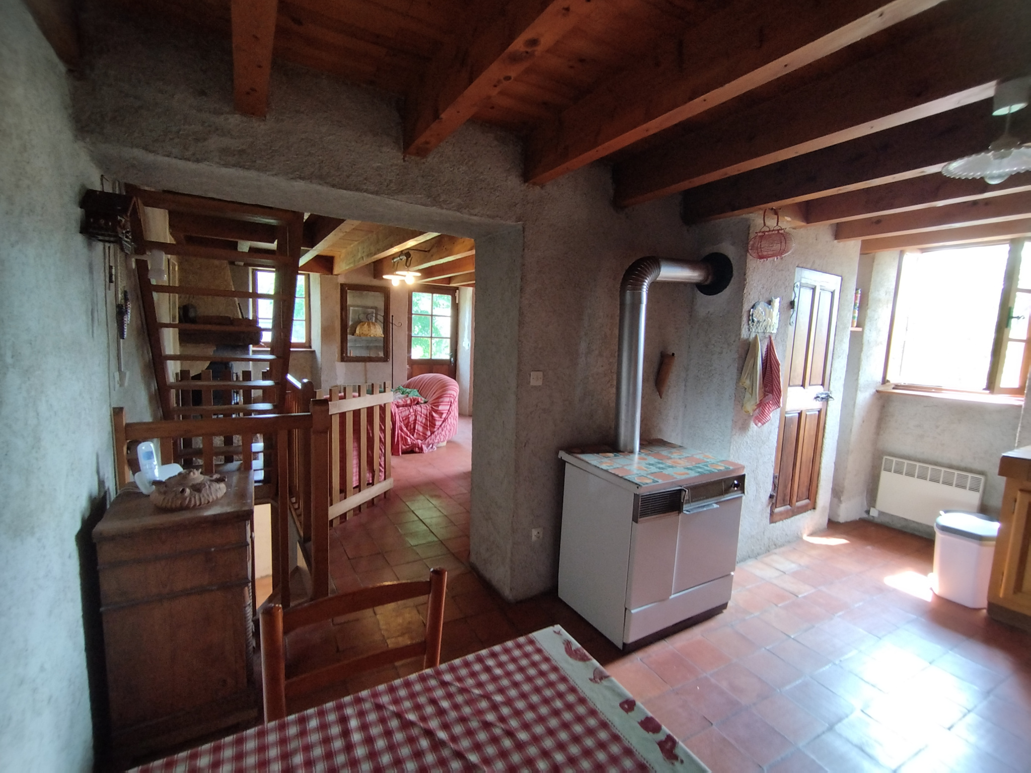 La maison d'environ 115m2 est composée au niveau plain-pied d'une pièce de vie et d'une cuisine séparée équipée.