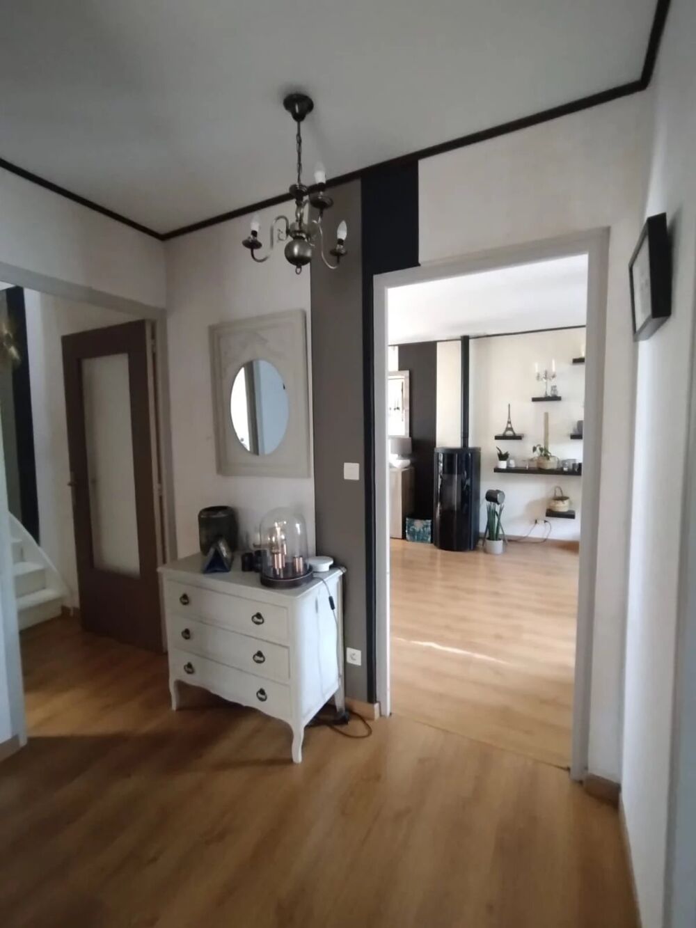 Une entrée avec placard intégré et parquet flottant,