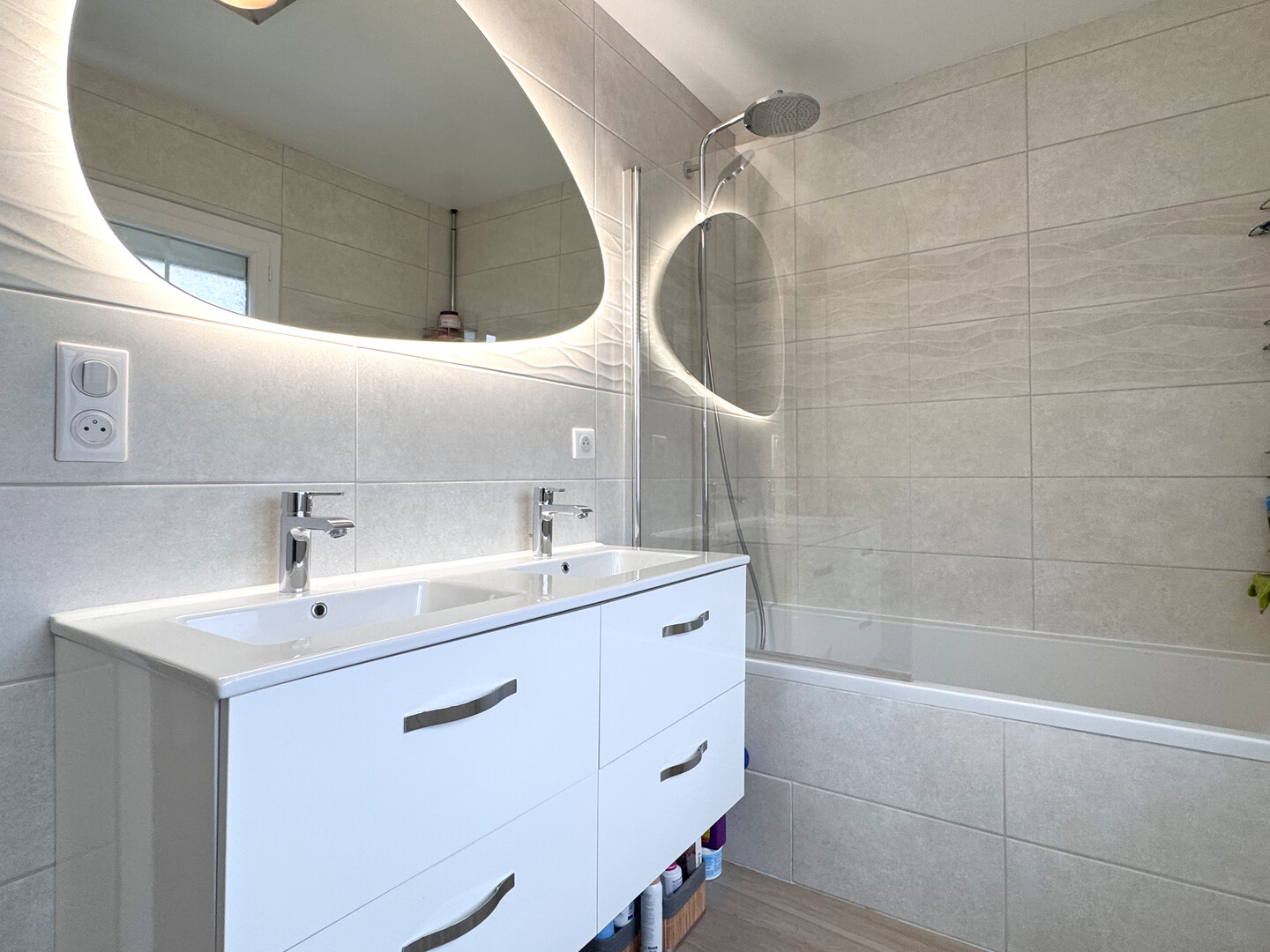 La cuisine aménagée et équipée est prolongée par un accès direct au garage, équipé d'une porte motorisée et d'une vaste mezzanine de stockage.