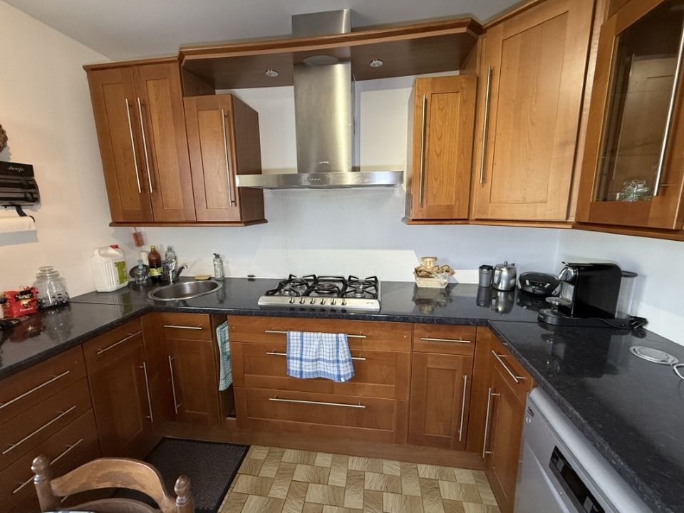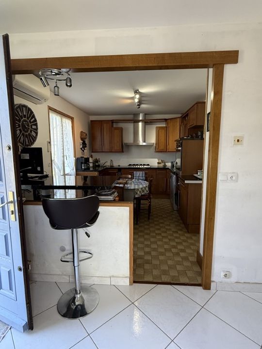 En rez-de-chaussée surélevé : entrée, séjour /salon donnant sur un balcon, cuisine ouverte aménagée et équipée, couloir desservant 2 chambres, salle de bains, WC séparés.