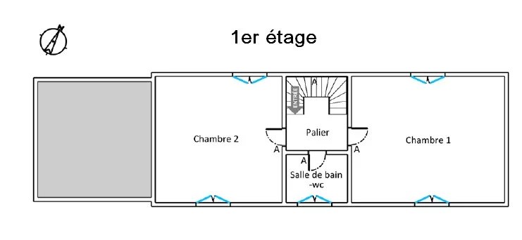 A l'étage: 2 grandes chambres et une salle de bains.