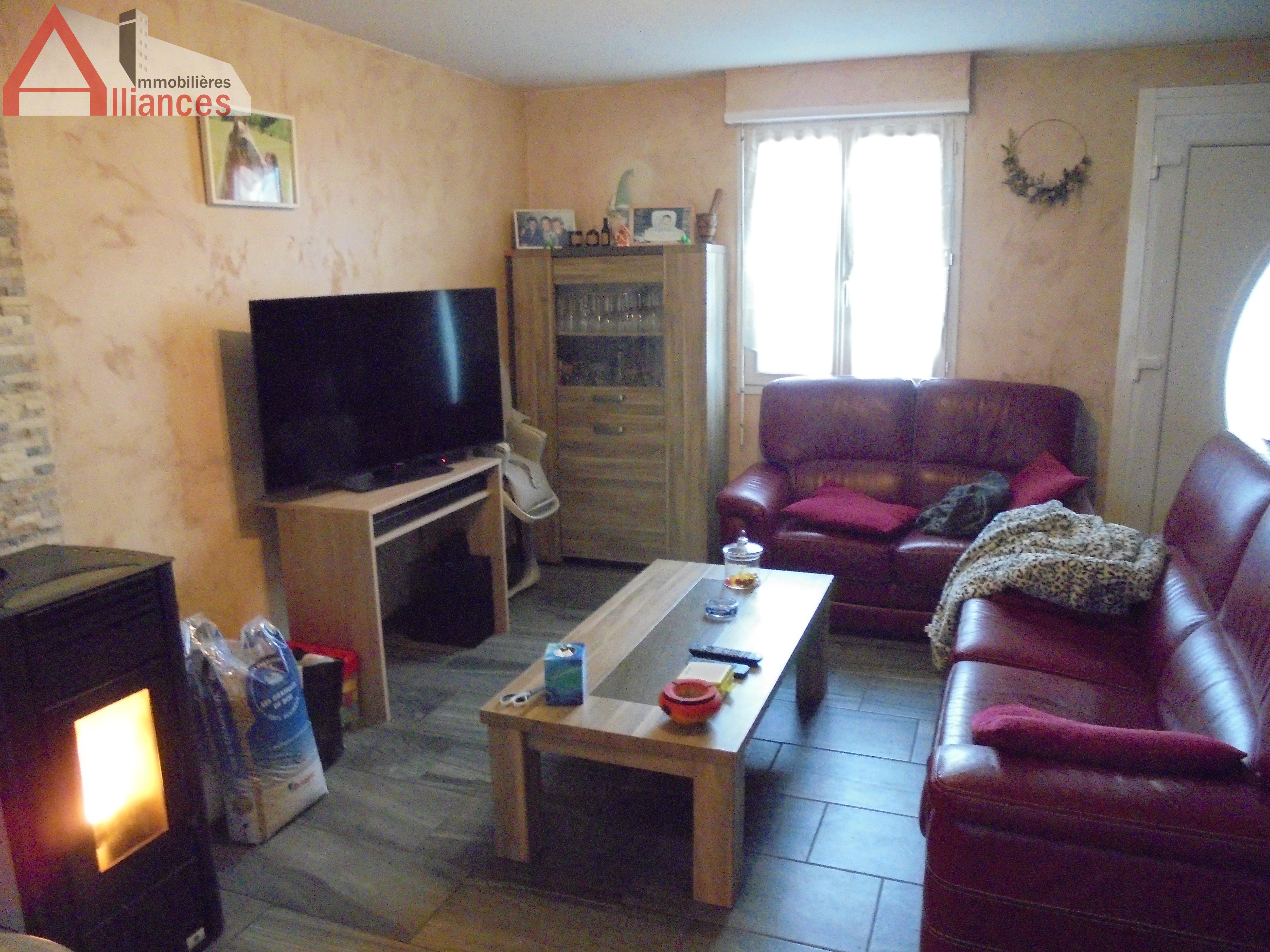 RDC : Salon et salle à manger, cuisine ouverte équipée, cellier, WC, poêle à pellet.