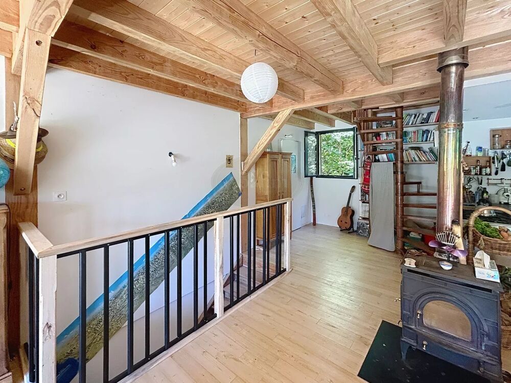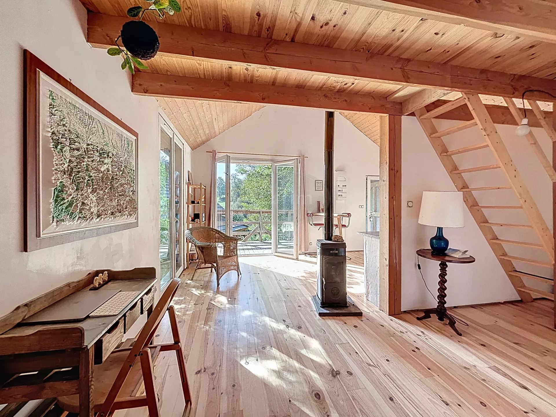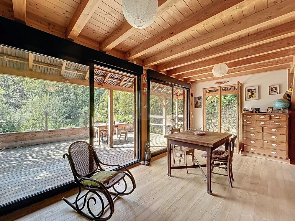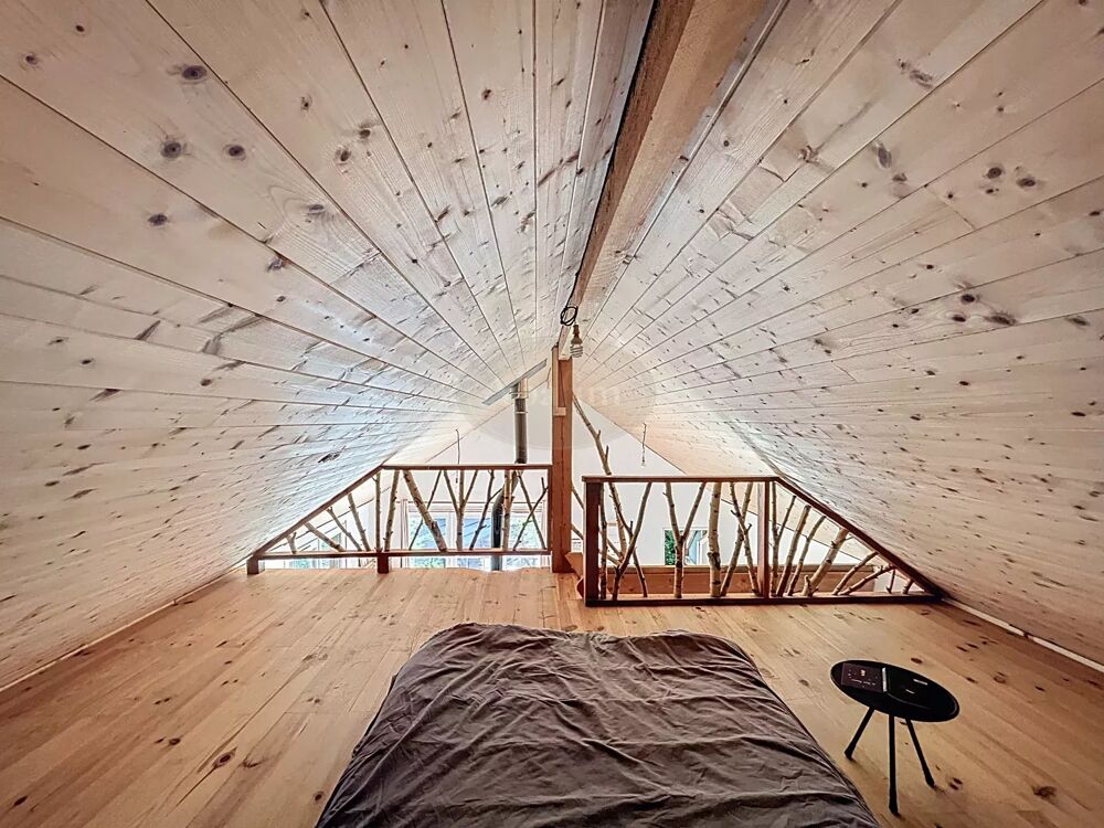 Un bel escalier en bois vous mène à l'étage où vous découvrirez une magnifique pièce de vie de 45 m² avec cuisine ouverte, un poêle à bois et de grandes baies vitrées ouvertes sur une belle terrasse (25 m²) exposée Sud avec vue sur la propriété et les montagnes.