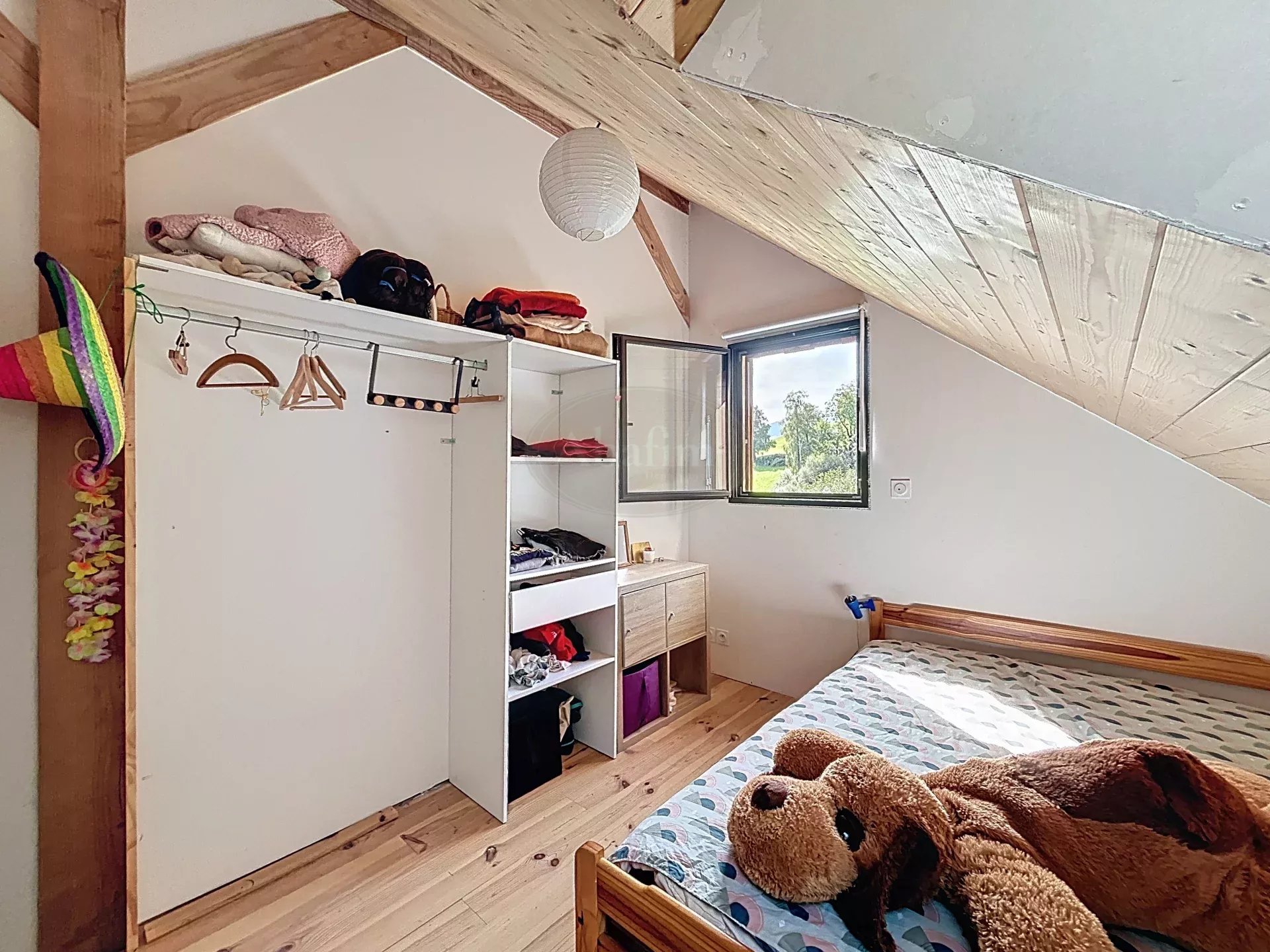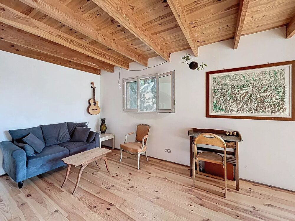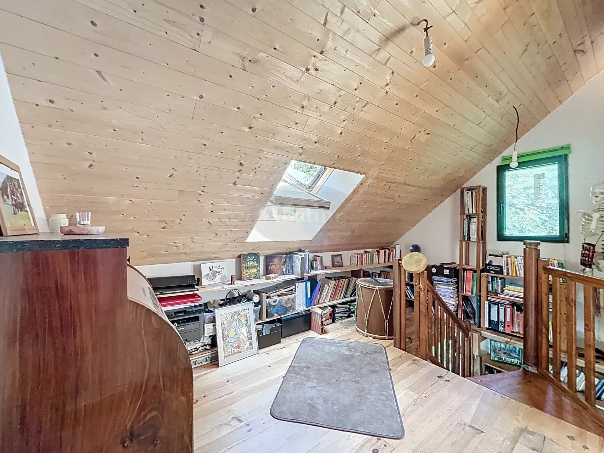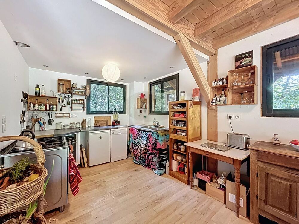 Un bel escalier en bois vous mène à l'étage où vous découvrirez une magnifique pièce de vie de 45 m² avec cuisine ouverte, un poêle à bois et de grandes baies vitrées ouvertes sur une belle terrasse (25 m²) exposée Sud avec vue sur la propriété et les montagnes.