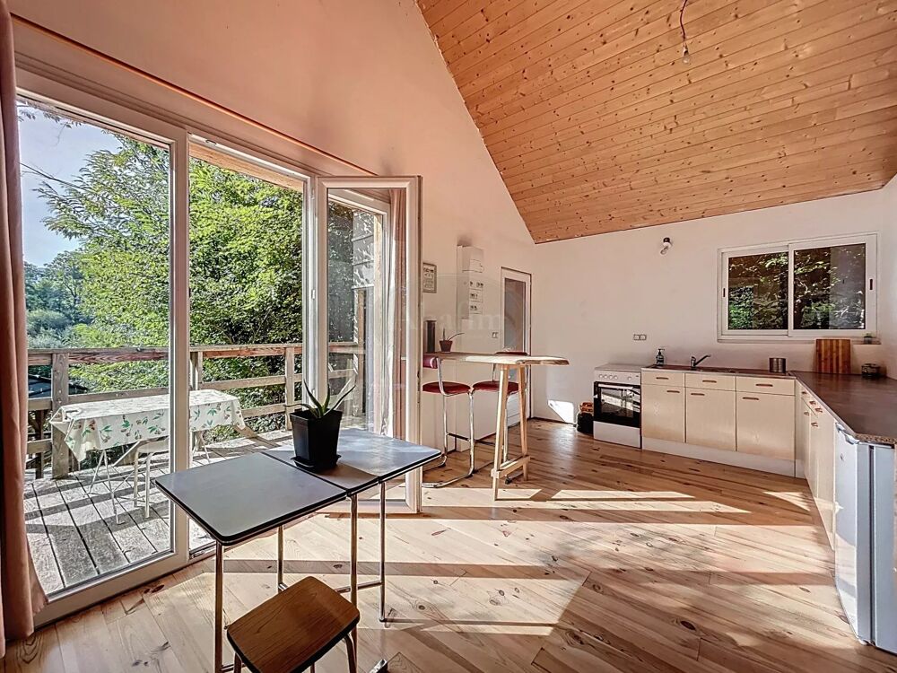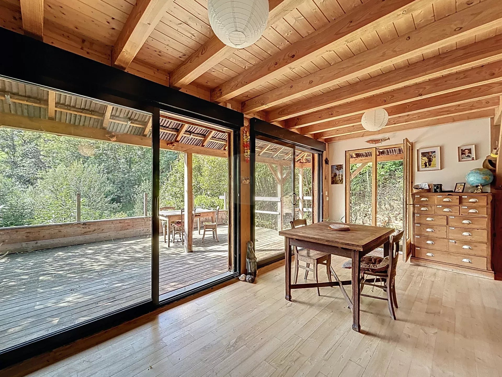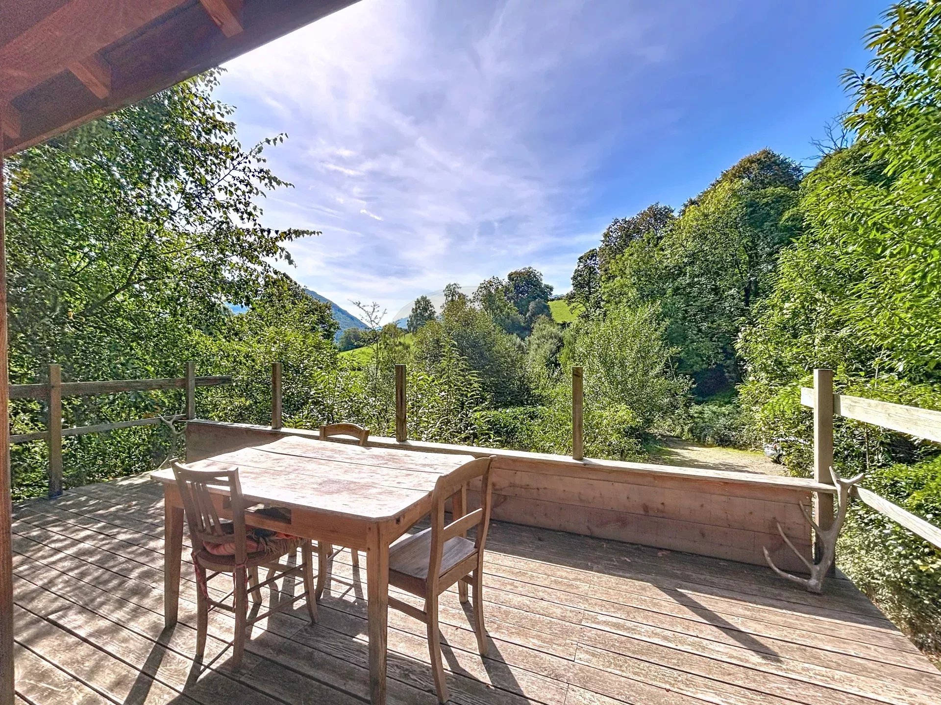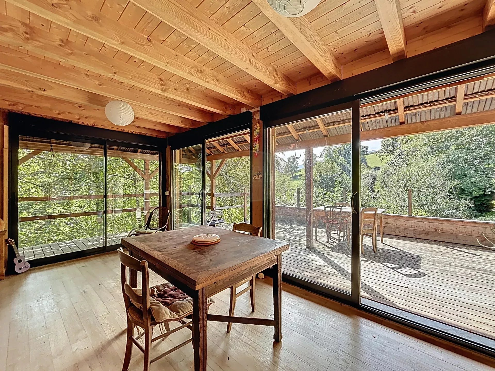 La pièce de vie s'ouvre sur une jolie terrasse avec sa vue et son calme: il n'est pas rare de partager son café matinal avec les écureuils!