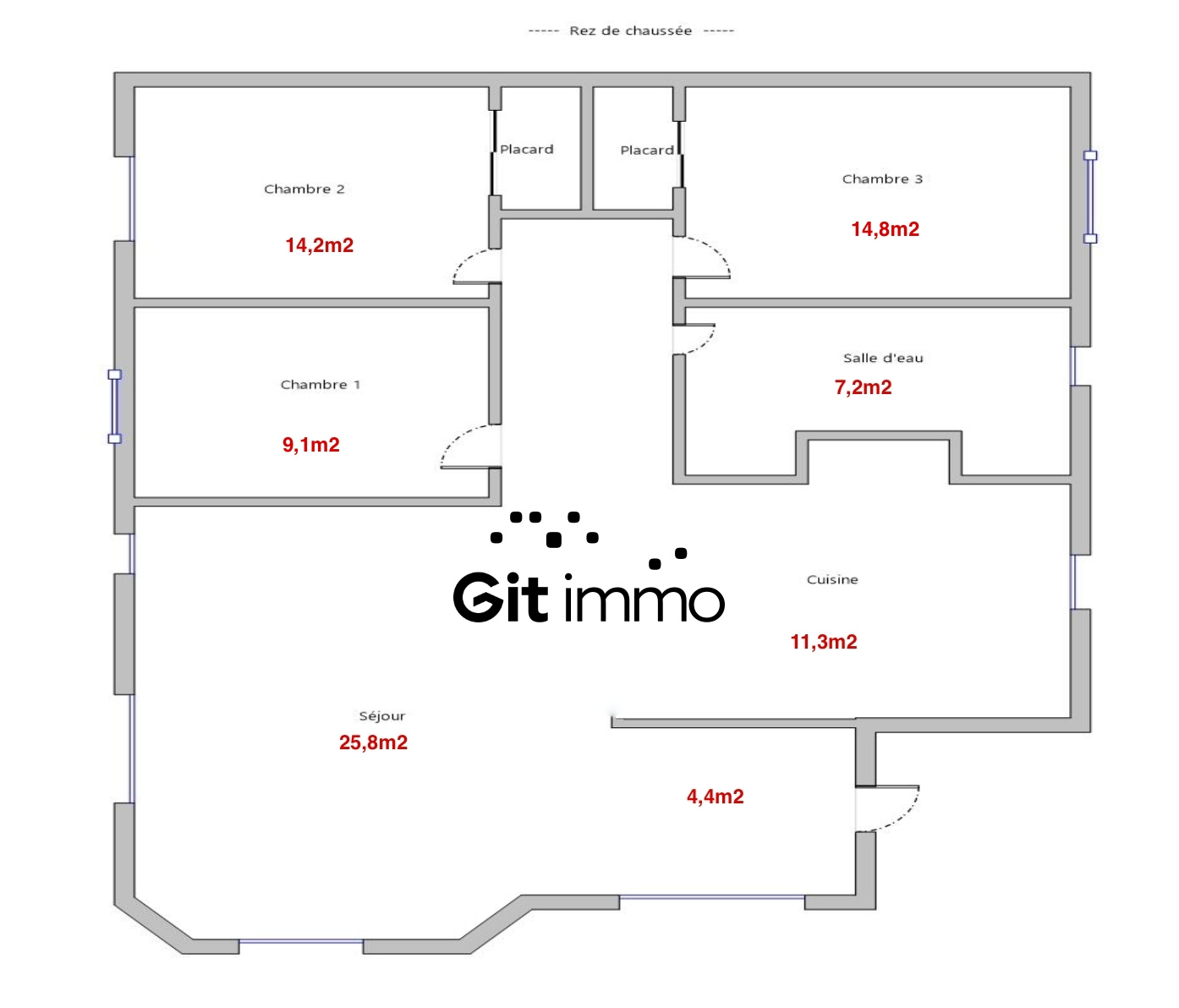 D'une surface de 91.9m2 Carrez, elle est composée d'une pièce à vivre de 26m2, d'une grande cuisine totalement aménagée et équipée ouverte sur le séjour, de 3 chambres dont 2 avec placards et d'une salle d'eau avec wc.
