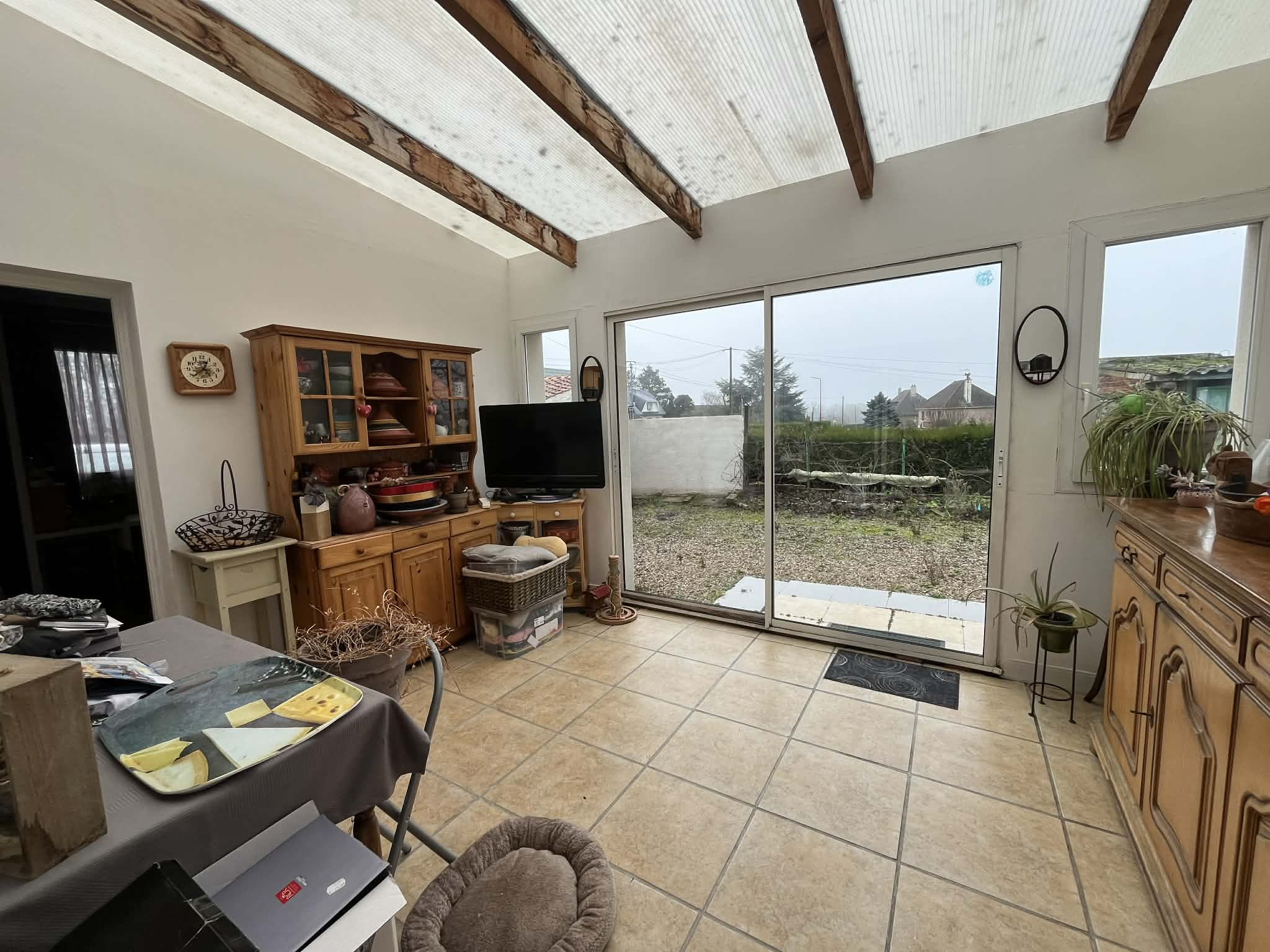 Dès l'entrée, vous serez séduit par un espace de vie chaleureux comprenant un salon cosy et une salle à manger conviviale d'environ 35,5 m2, une cuisine ouverte de 12,8 m2, parfaite pour les repas en famille. Vous y trouverez également deux chambres (9,2 m2 et 12,2 m2), une salle de bain avec WC, une laverie, ainsi qu'une véranda baignée de lumière de 13,7 m2, ouverte sur le jardin