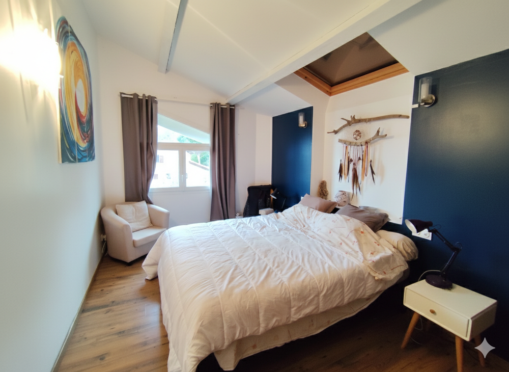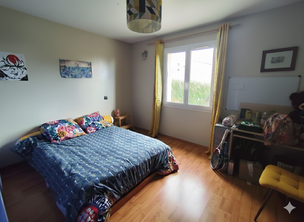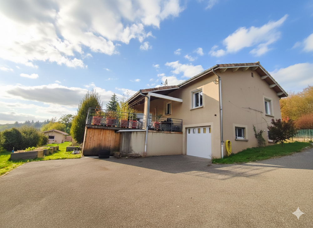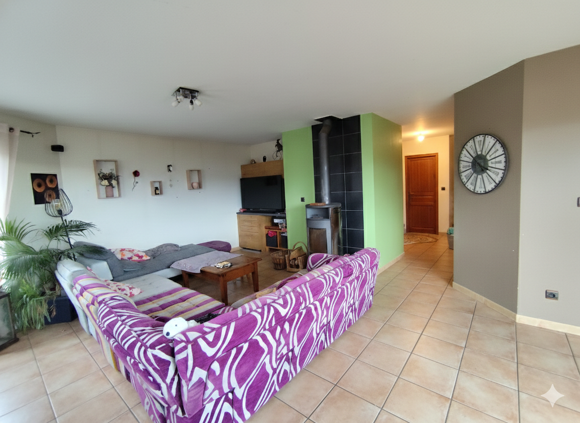 Maison individuelle de 165m2 construite en 2001, implantée sur un terrain entièrement clos de 1 867 m2. L'entrée dessert un dégagement avec placard et un WC séparé. L'espace de vie se compose d'un salon chaleureux avec poêle à bois et d'une cuisine ouverte meublée et entièrement équipée. Un demi niveau accueille une salle de bain avec douche et baignoire, double vasque et sèche serviette électrique, ainsi que trois chambres de 13m2, 13m2 et 11m2, toutes équipées de placards et de parquet flottant.