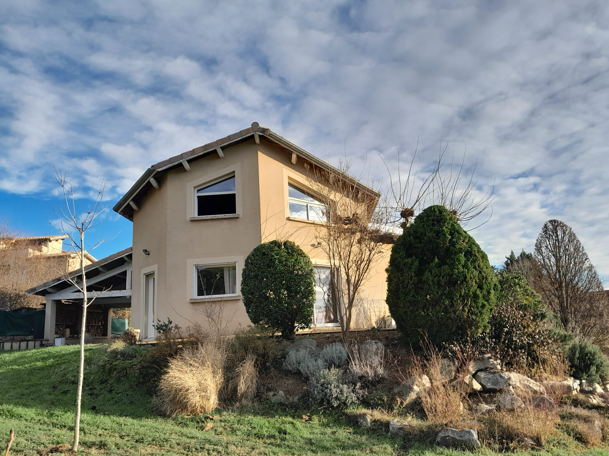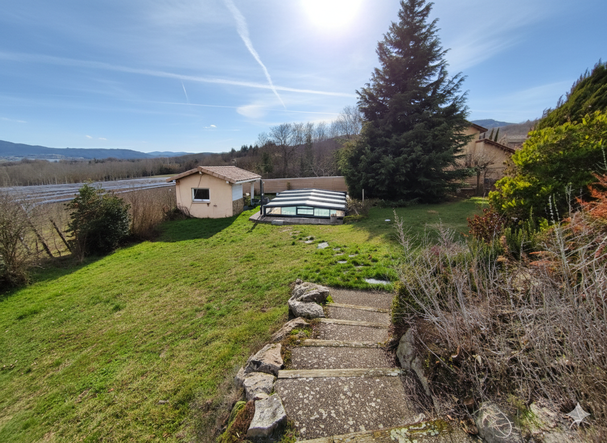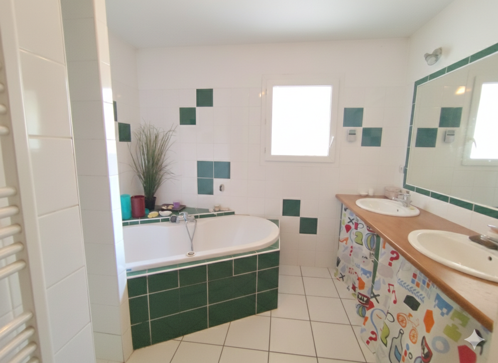 Maison individuelle de 165m2 construite en 2001, implantée sur un terrain entièrement clos de 1 867 m2. L'entrée dessert un dégagement avec placard et un WC séparé. L'espace de vie se compose d'un salon chaleureux avec poêle à bois et d'une cuisine ouverte meublée et entièrement équipée. Un demi niveau accueille une salle de bain avec douche et baignoire, double vasque et sèche serviette électrique, ainsi que trois chambres de 13m2, 13m2 et 11m2, toutes équipées de placards et de parquet flottant.