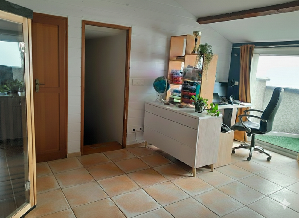 Un second demi-niveau offre un espace bureau et petit salon donnant sur une terrasse, une salle d'eau avec WC et placard, ainsi qu'une chambre avec dressing et parquet. Un dégagement mansardé complète l'étage.