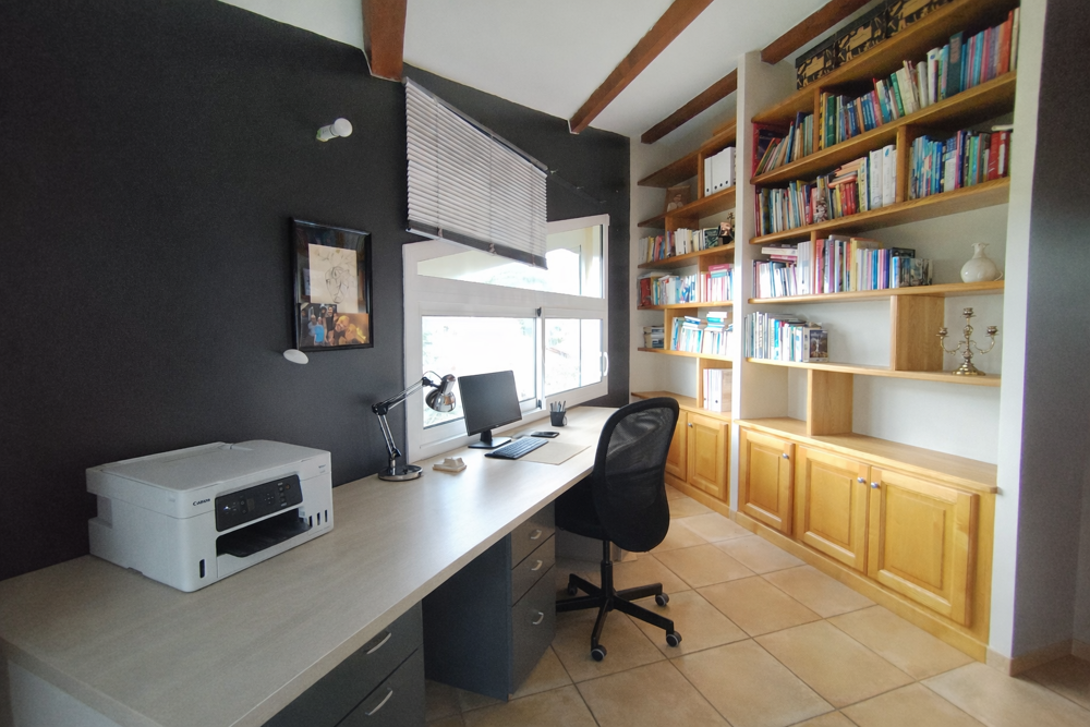 La maison est équipée d'une pompe à chaleur air eau avec chauffage au sol, de deux cumulus, de menuiseries en double vitrage PVC et aluminium pour les baies, ainsi que de volets roulants électriques.