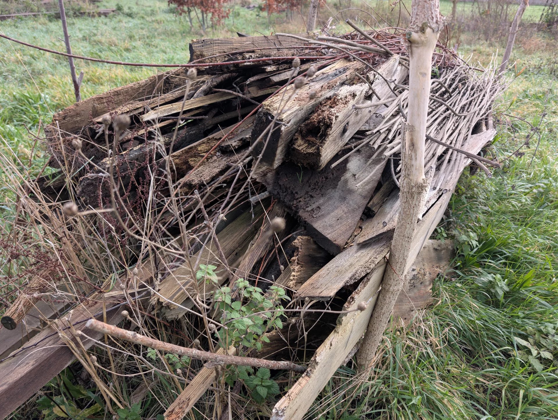 Une grange qui s'est effondrée suite à une tempête, mais encore inscrite au cadastre, et pour laquelle une brochure avec une description (y compris mesures) de l'ancien bâtiment (produit par les Maisons paysannes de France) est disponible.