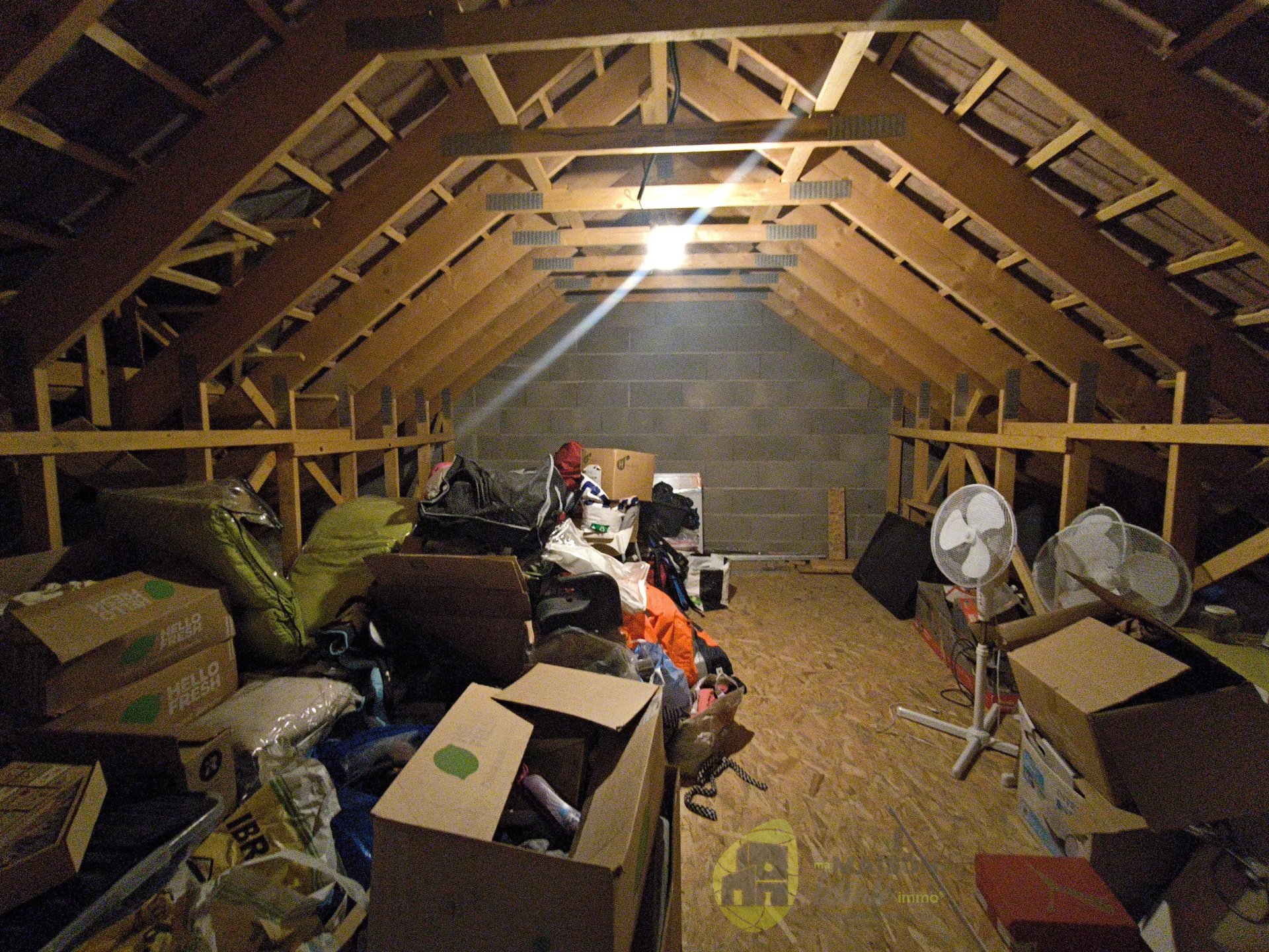Combles aménageables accessibles par un escalier depuis le couloir du garage d'une surface d'environ 30m² (charpente renforcée, plancher et attentes sanitaires en place).