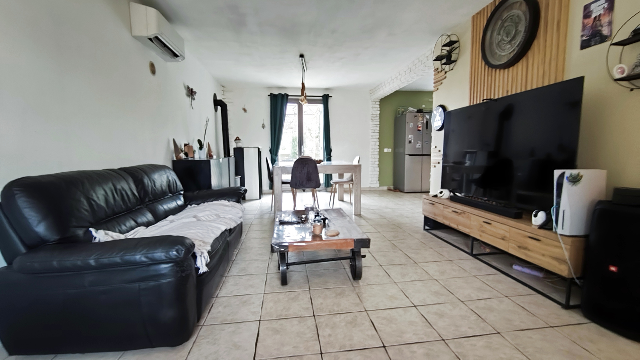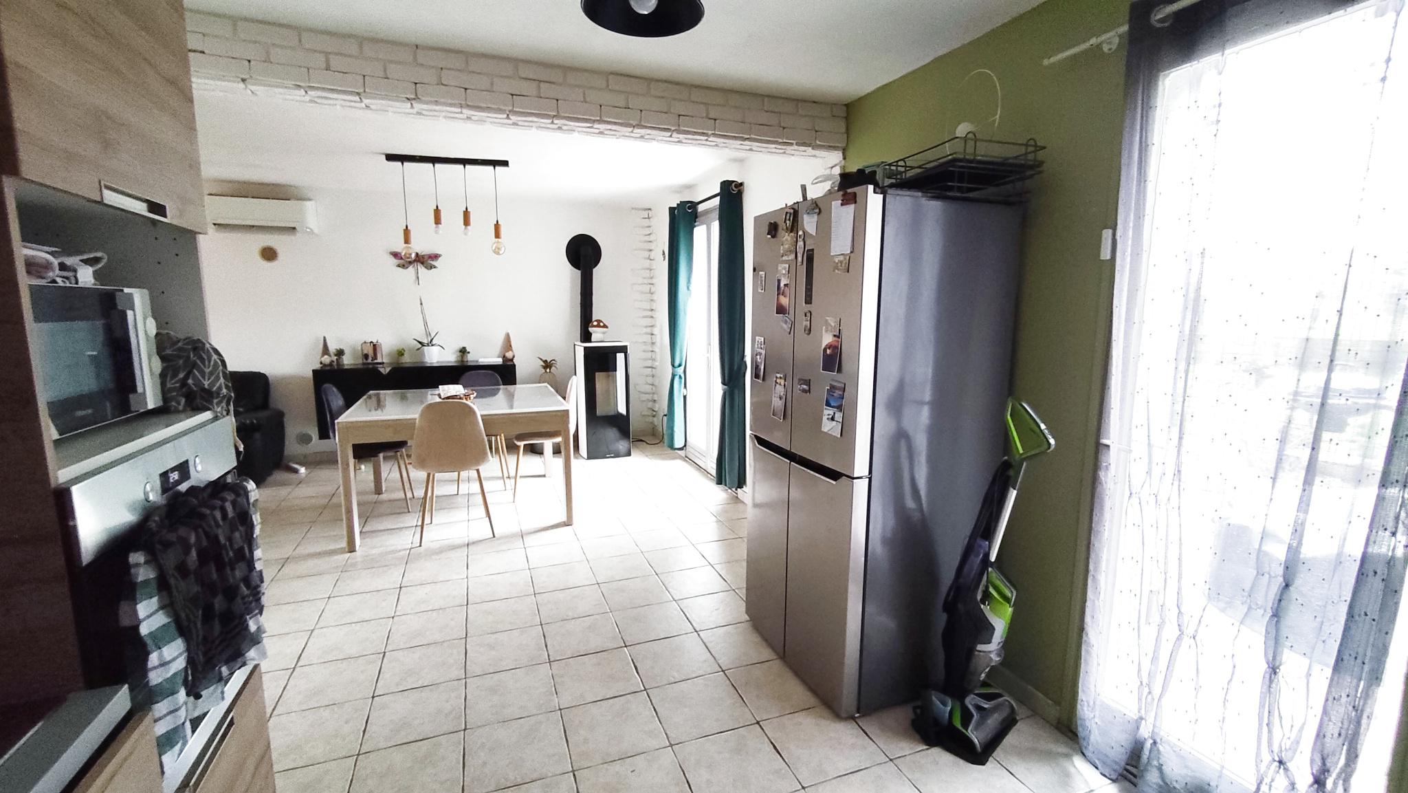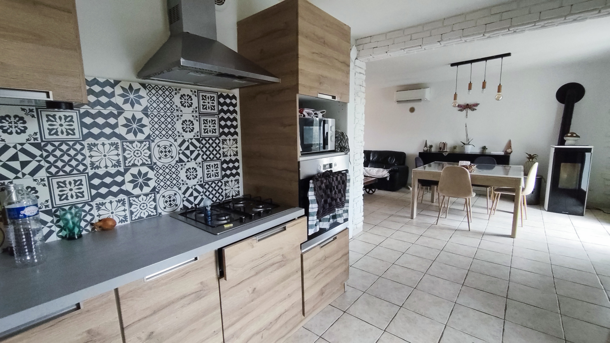 Au rez-de-chaussée, vous serez séduit par une belle pièce de vie lumineuse, équipée d'une climatisation, avec cuisine moderne entièrement équipée et ouverte sur le salon/séjour avec son poele à granulé.