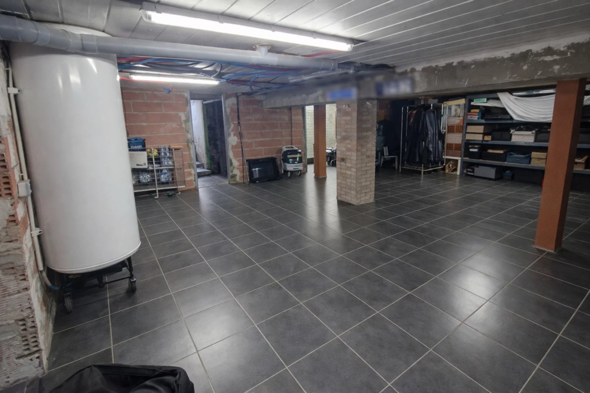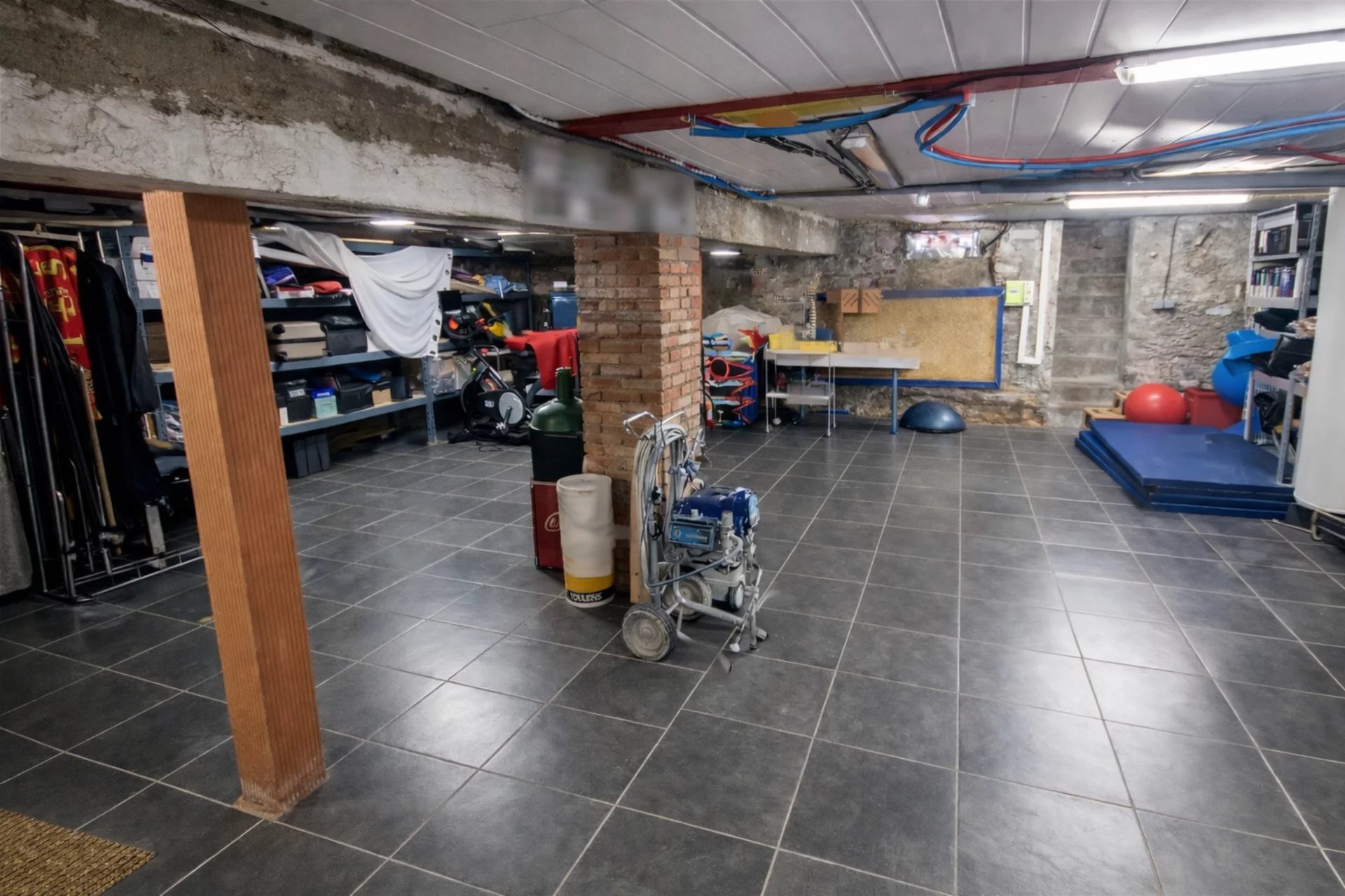 Sous-sol carrelé de 80 m² (rangements, atelier, salle de sport)