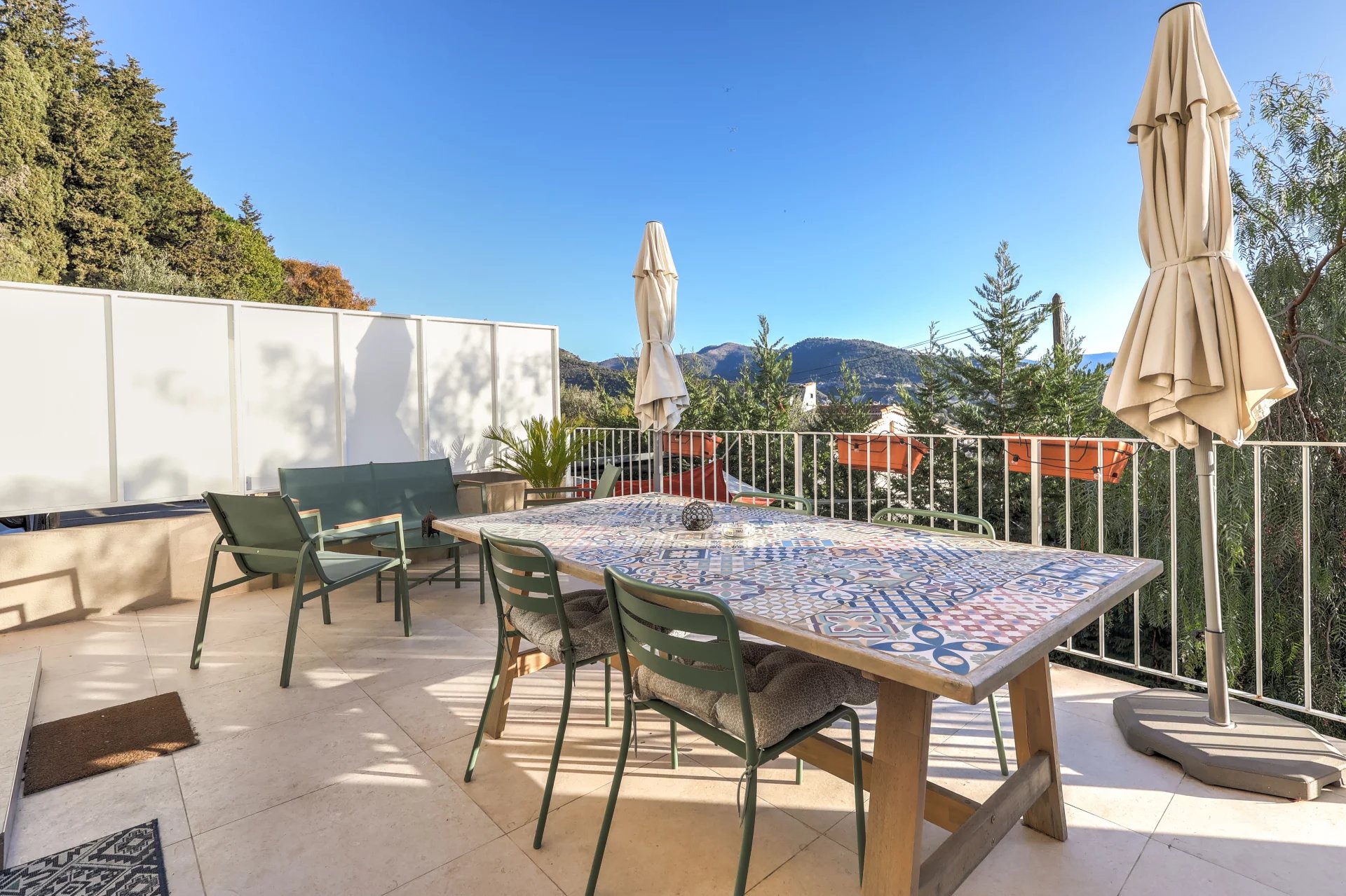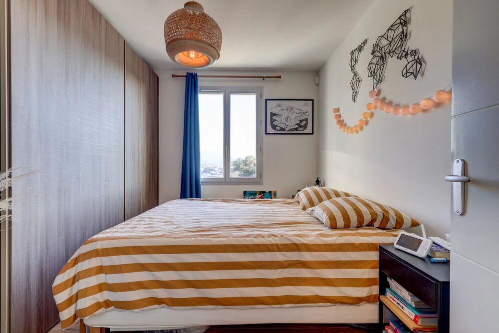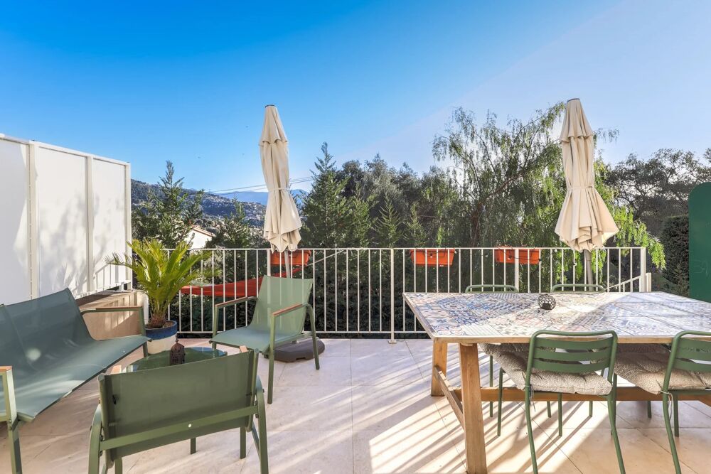 À l'étage se trouve l'espace nuit, composé d'une chambre parentale avec rangements et vue sur le village de Falicon, ainsi que deux autres chambres.