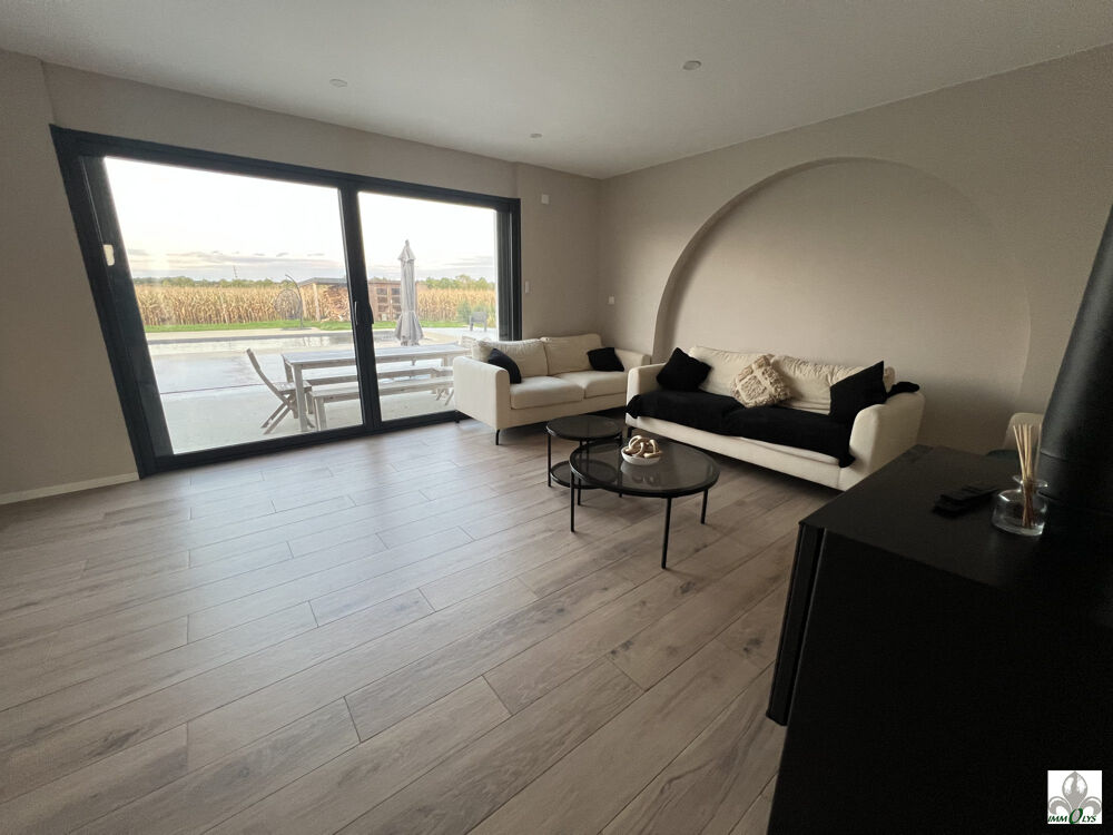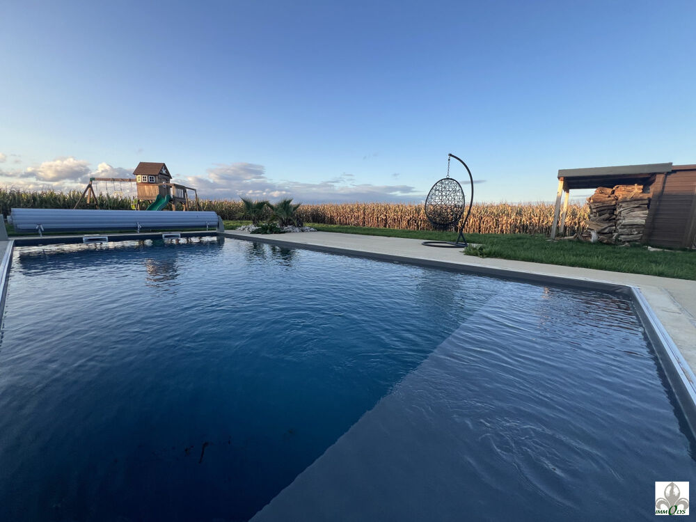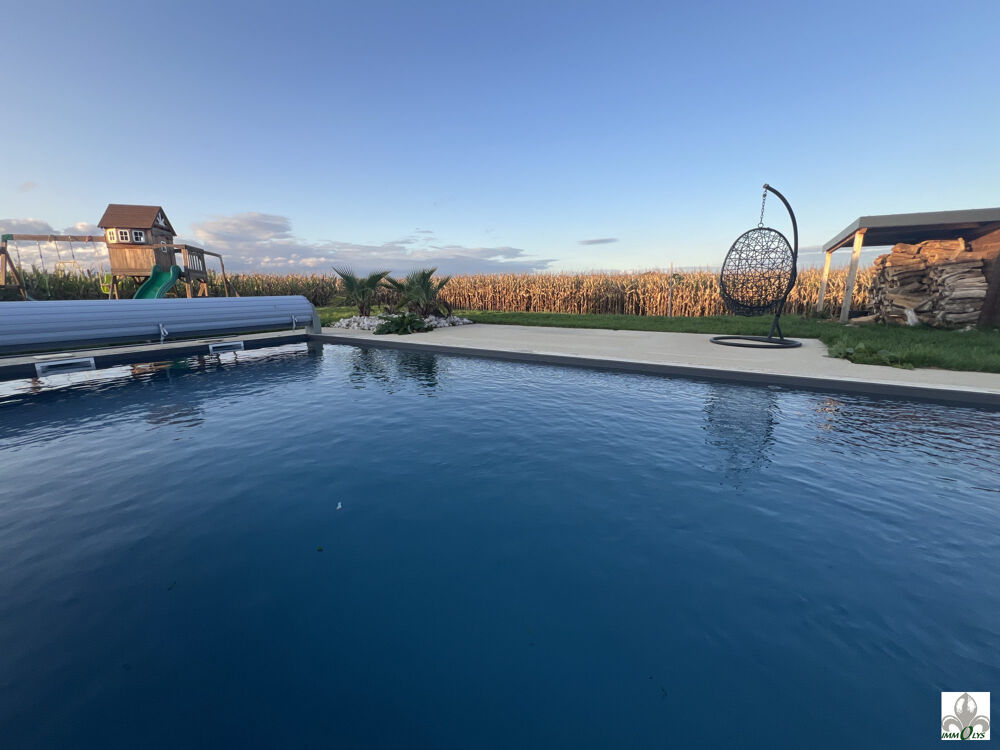 Sur un terrain de 1026 m² avec vu sur champs, le charme opère immédiatement : une très grande terrasse entoure une superbe piscine de 9 x 4 m, idéale pour profiter des beaux jours et créer différentes ambiances.