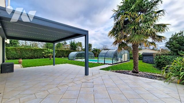 Depuis l'entrée, vous accédez au vaste séjour ouvert sur le jardin au SUD, où la terrasse avec pergola est une véritable extension de la maison aux beaux jours..