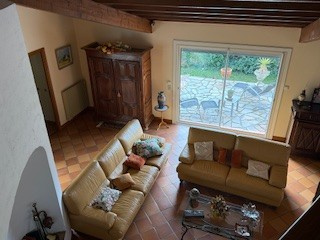 L'espace jour comprend: un grand salon/séjour avec cheminée et accès aux deux terrasses (dont une est couverte), une cuisine séparée, meublée et semi-équipée, avec accès au garage et à la buanderie.