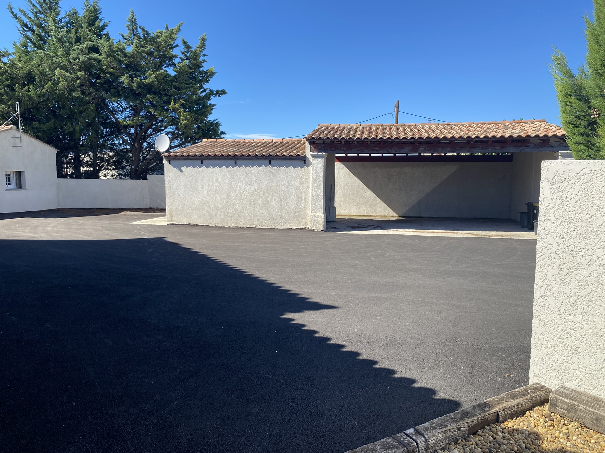 Prestations techniques : Pompe à chaleur, climatisation réversible, menuiseries aluminium et vaste espace de stationnement enrobé avec carport de 46 m2.