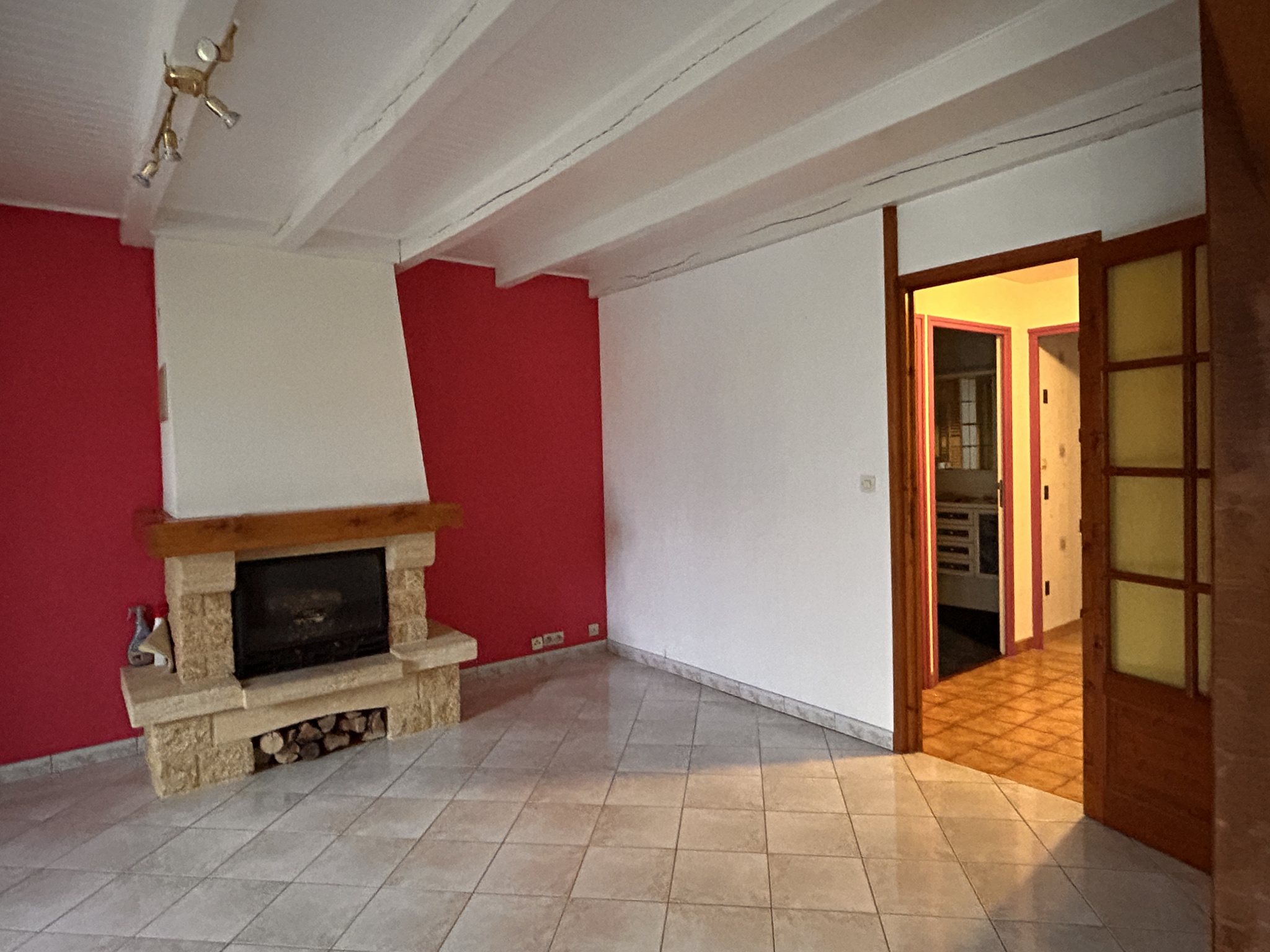 Demi-niveau : séjour, salon avec cheminée-insert ouvrant sur la terrasse et le jardin, une chambre, une salle d'eau et des toilettes.