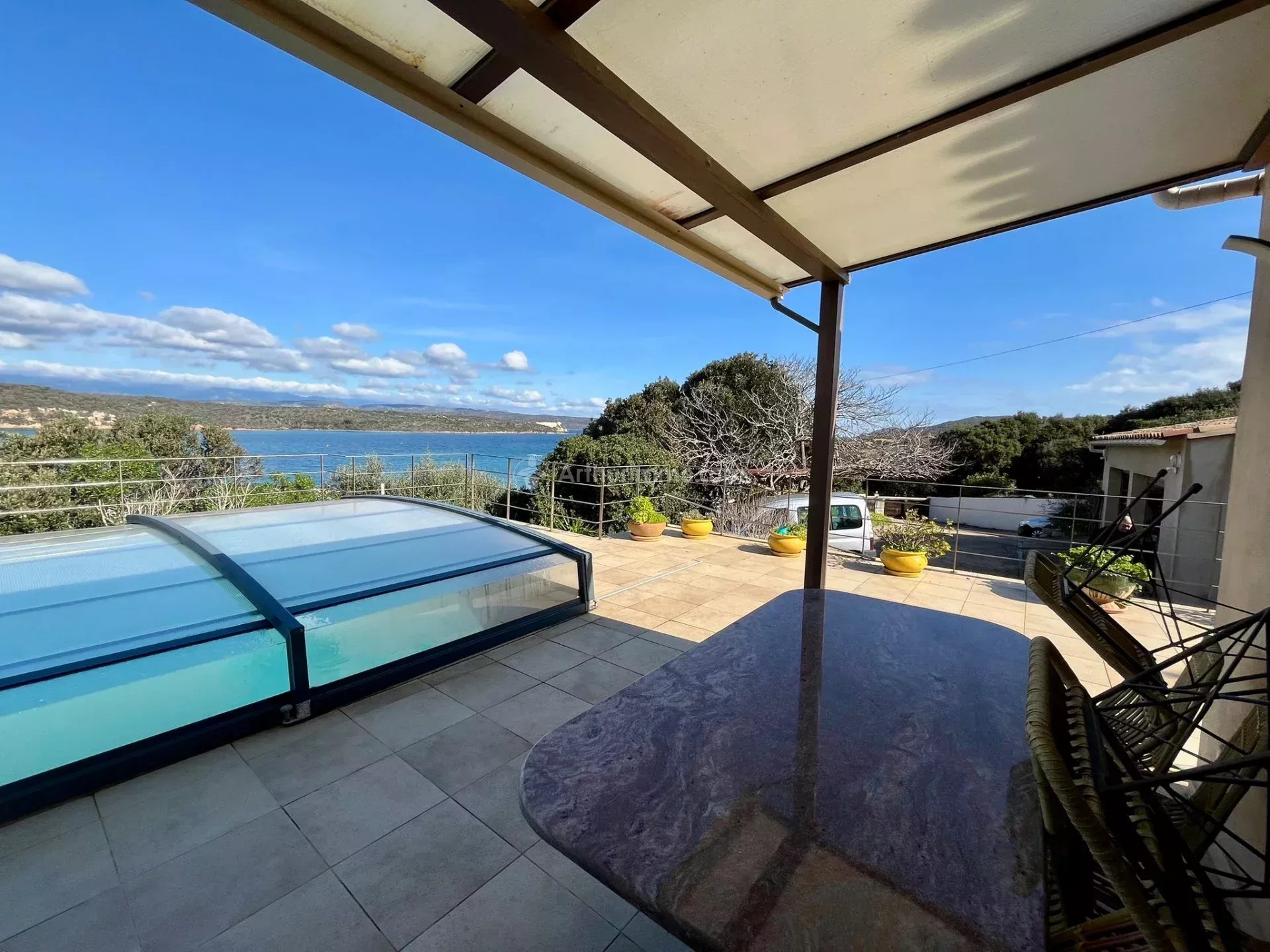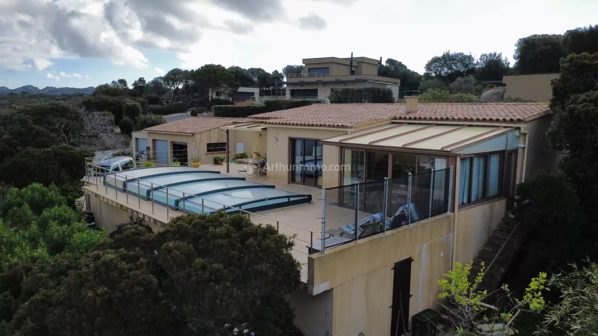 L'ensemble est implanté sur une jolie parcelle arborée de 1 814 m² avec terrasse et piscine, bénéficiant d'une magnifique vue dégagée sur la mer et les roches blanches de Bonifacio.
