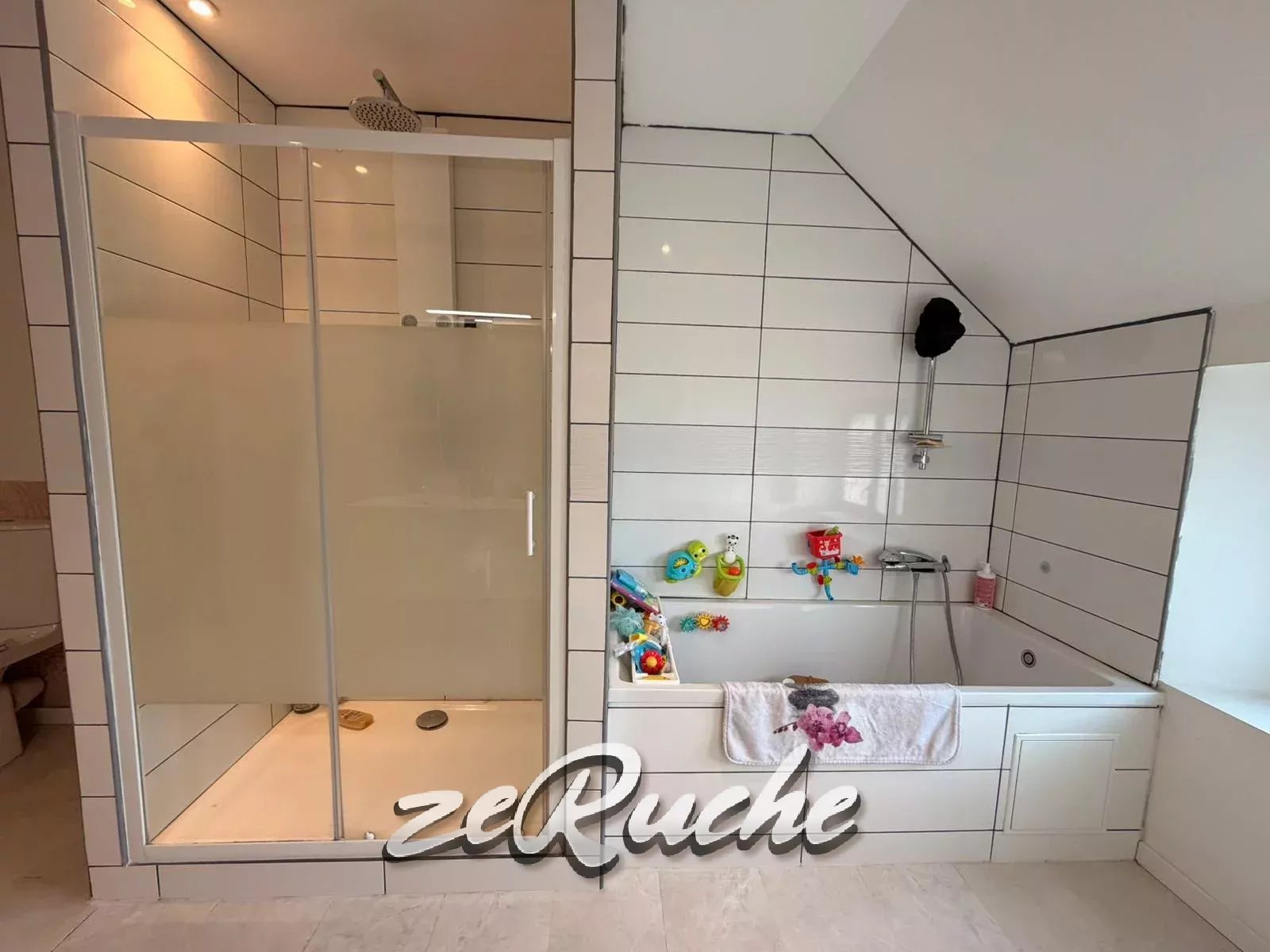 Une salle de bain avec une grande douche et une baignoire et wc.