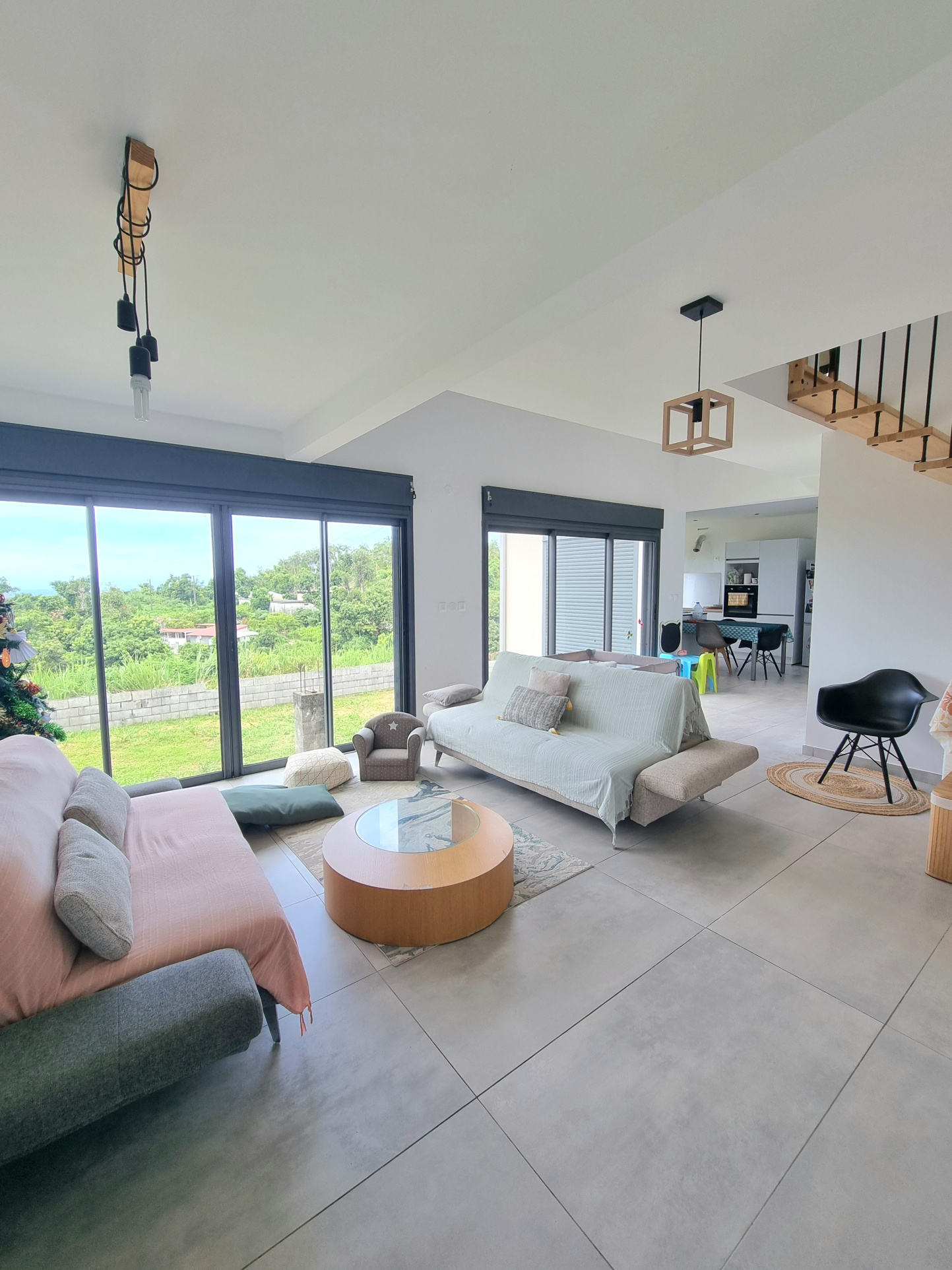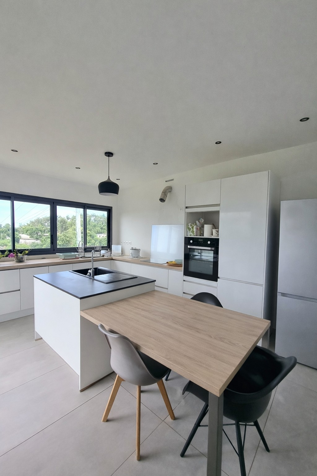 Une cuisine moderne entièrement équipée s'ouvre sur un vaste séjour baigné de lumière et climatisé.