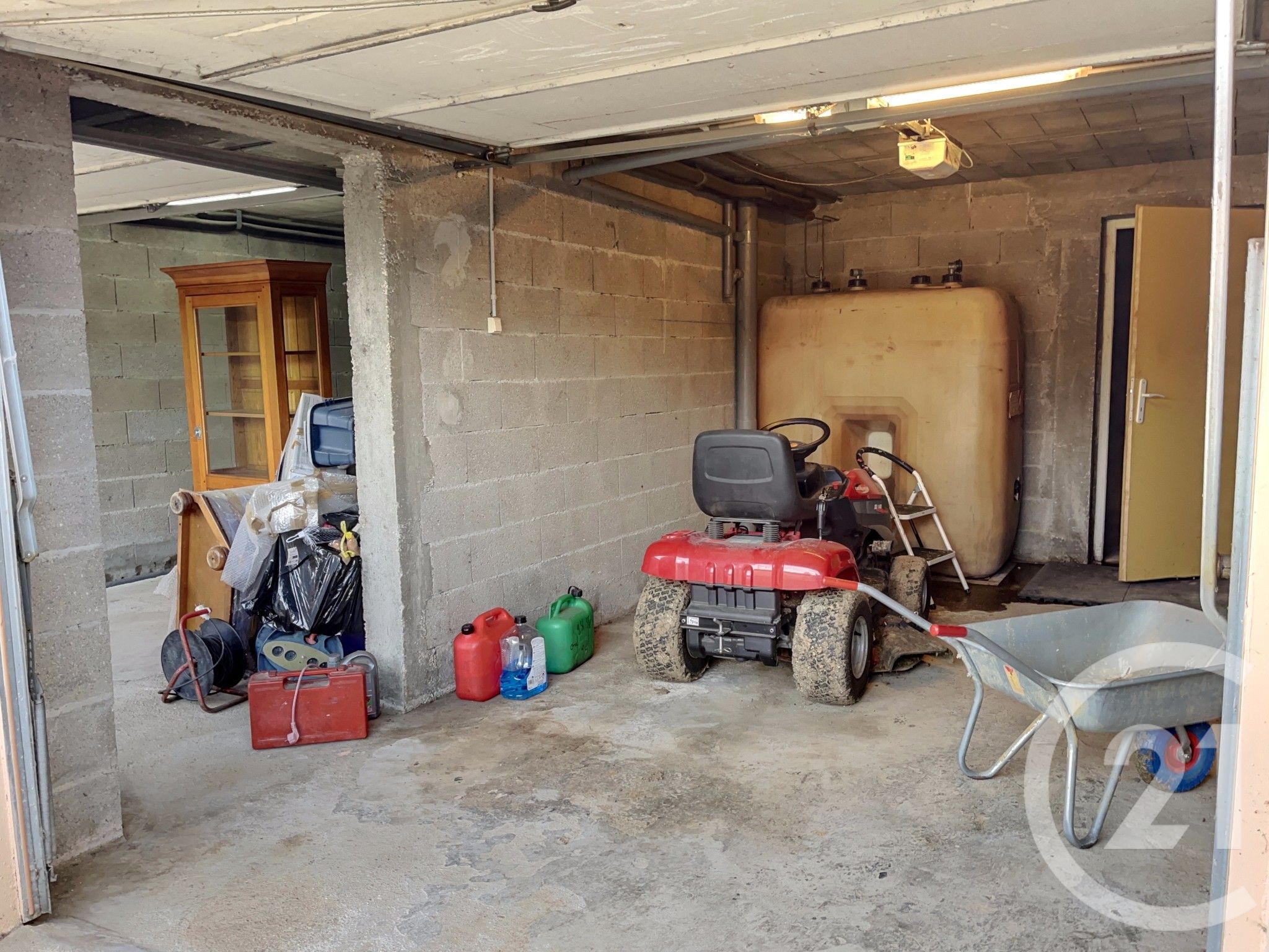 Sous-sol complet avec un double garage; un atelier et un espace de stockage.