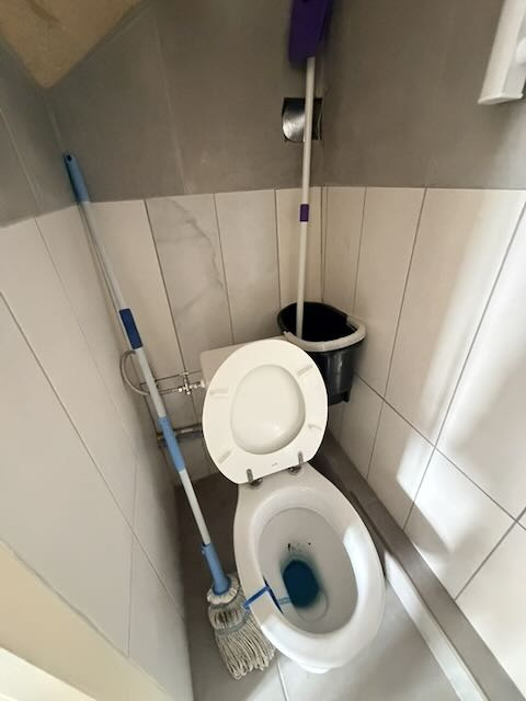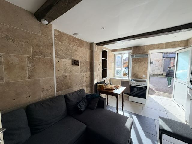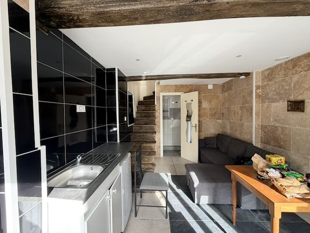 Sur 3 niveaux: mitoyenne d'un coté.RDC: Cuisine, carrelage, 16 m2. Salle d'eau et wc, 2,5 m2.