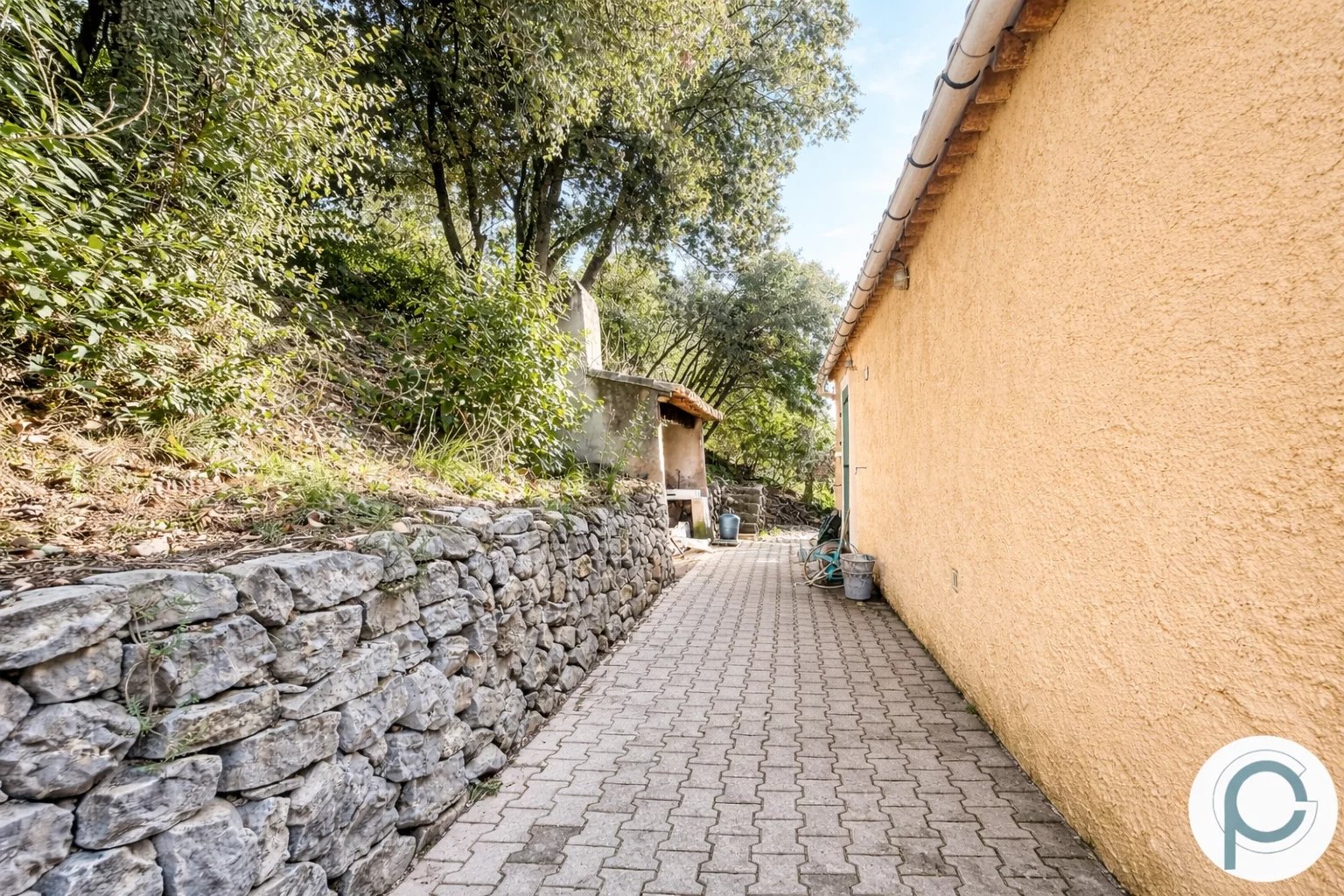 Terrain piscinable et air de stationnement pouvant accueillir plusieurs véhicules.