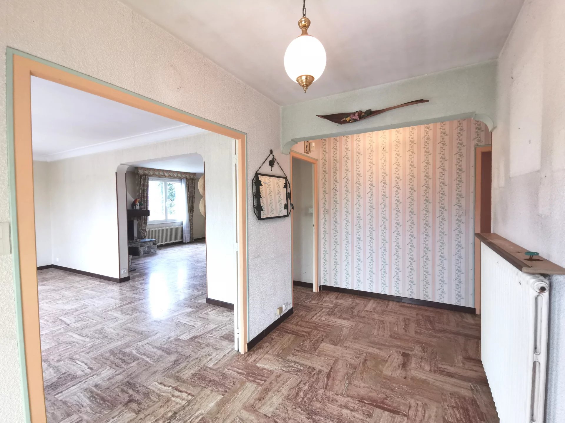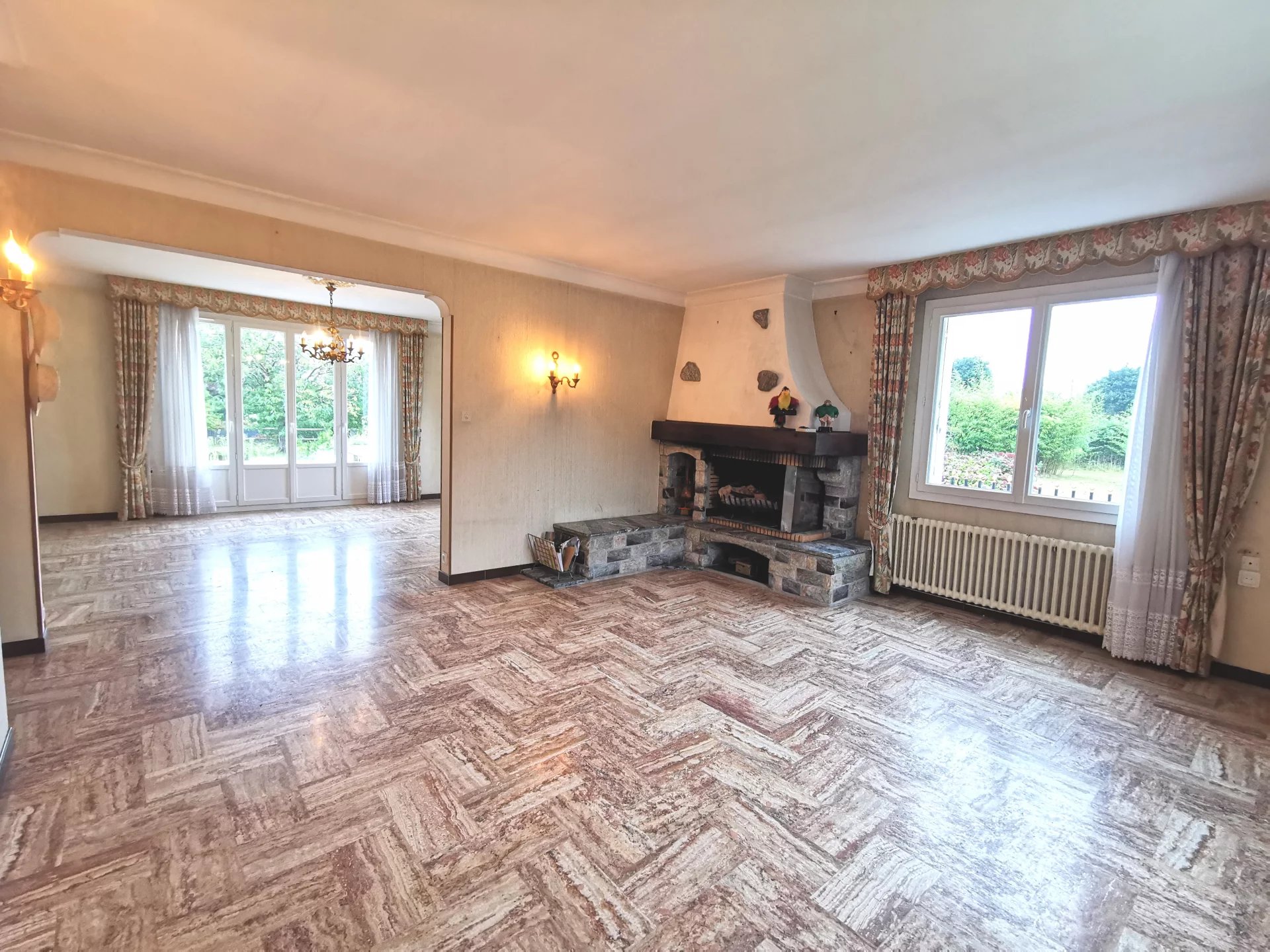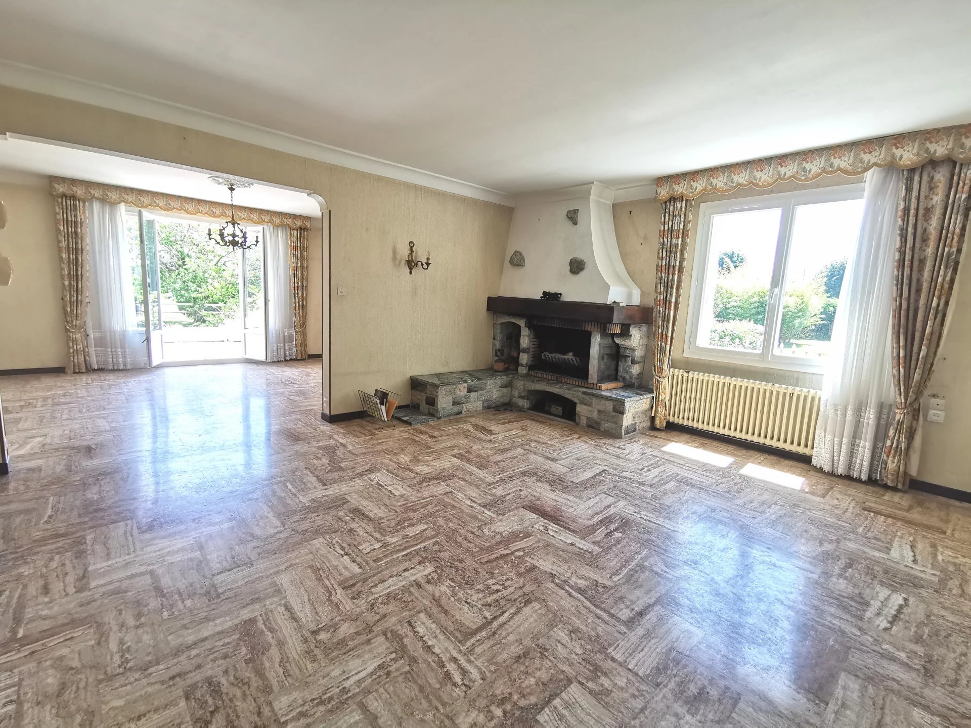 La salle à manger de 26m² donnant sur la terrasse est ouverte sur le salon séjour de 25m² avec cheminée à foyer ouvert (aujourd'hui condamné par une simple plaque de plâtre)