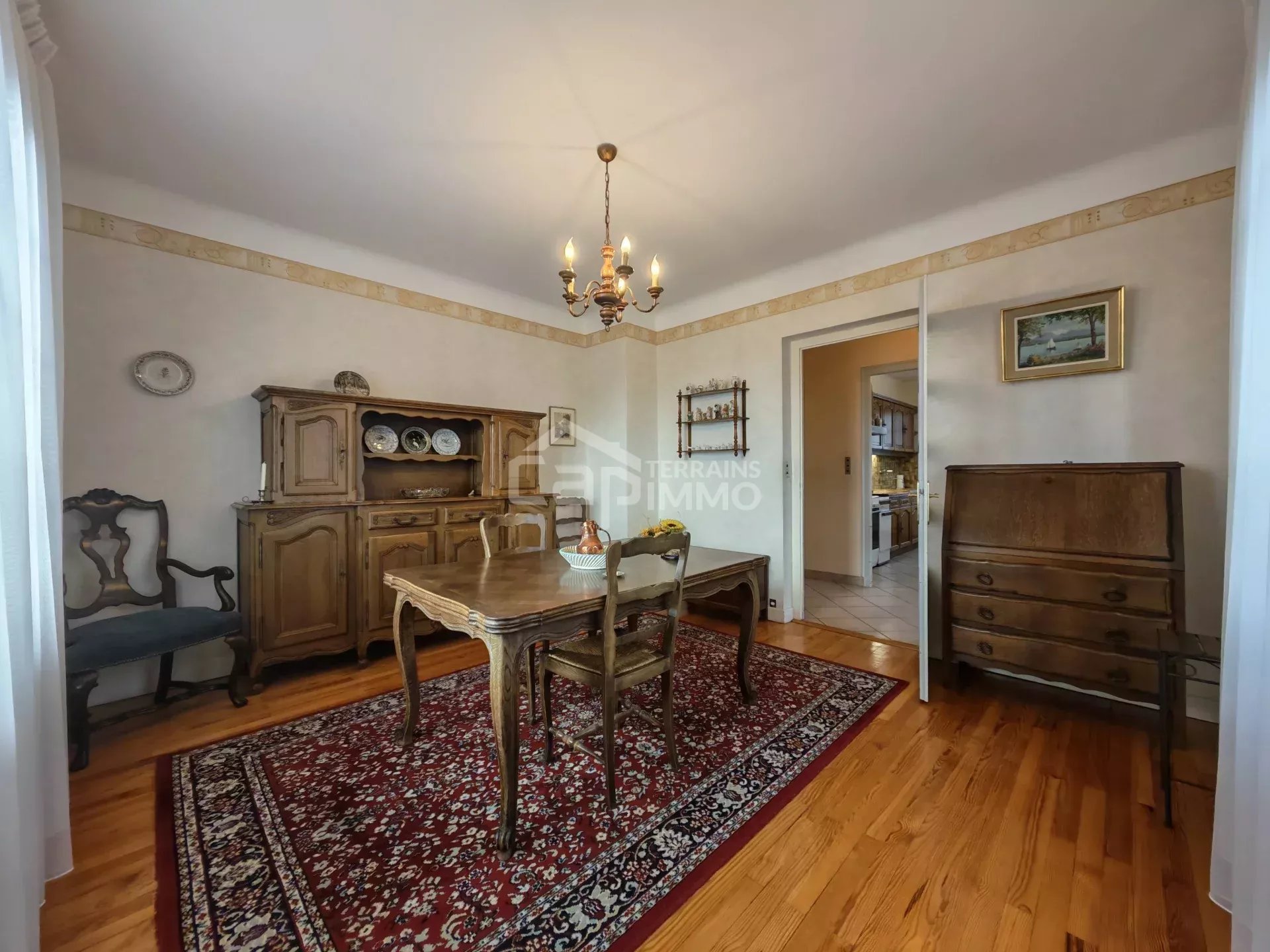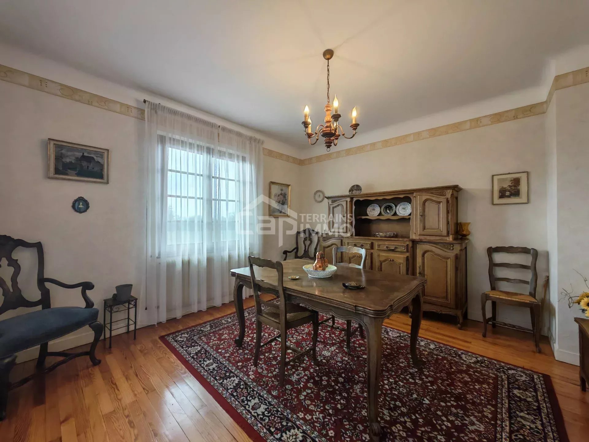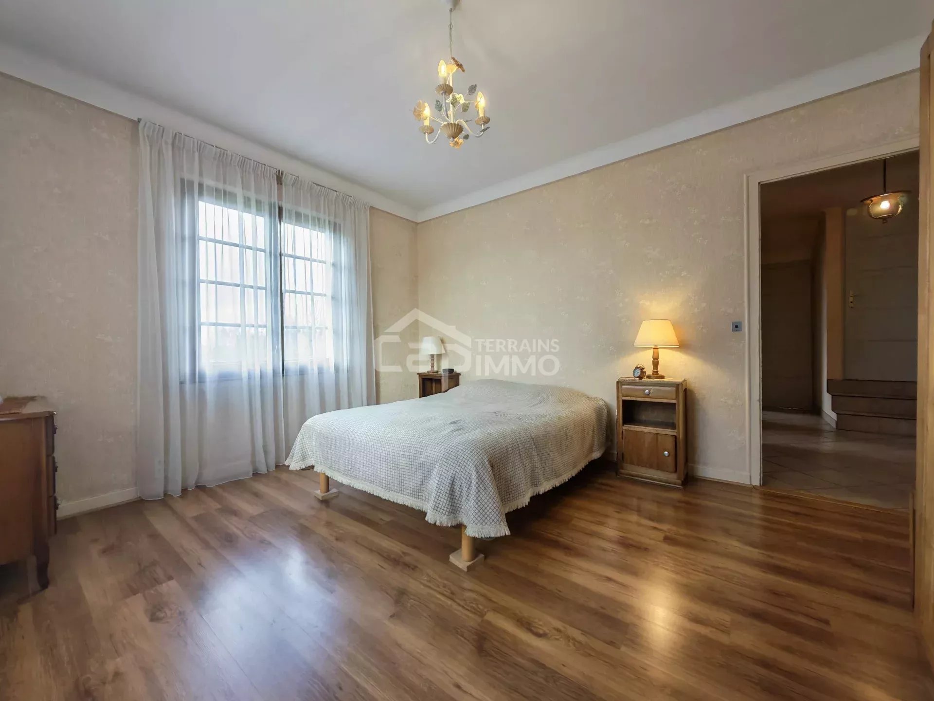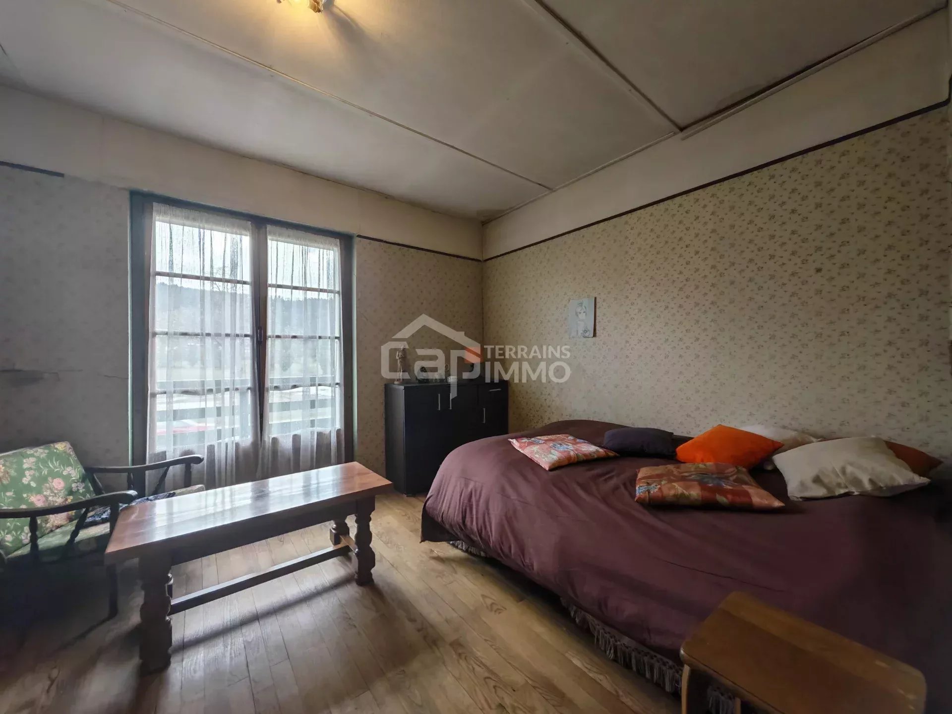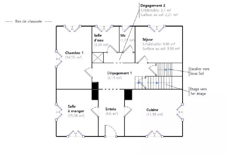 - Au rez-de-chaussée surélevé : Hall d'entrée, cuisine indépendante, séjour / salle à manger, dégagement, une grande chambre, une pièces polyvalente (salon/chambre/bureau), vestibule, salle d'eau, et WC indépendants.