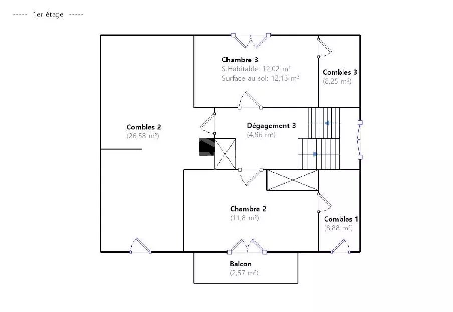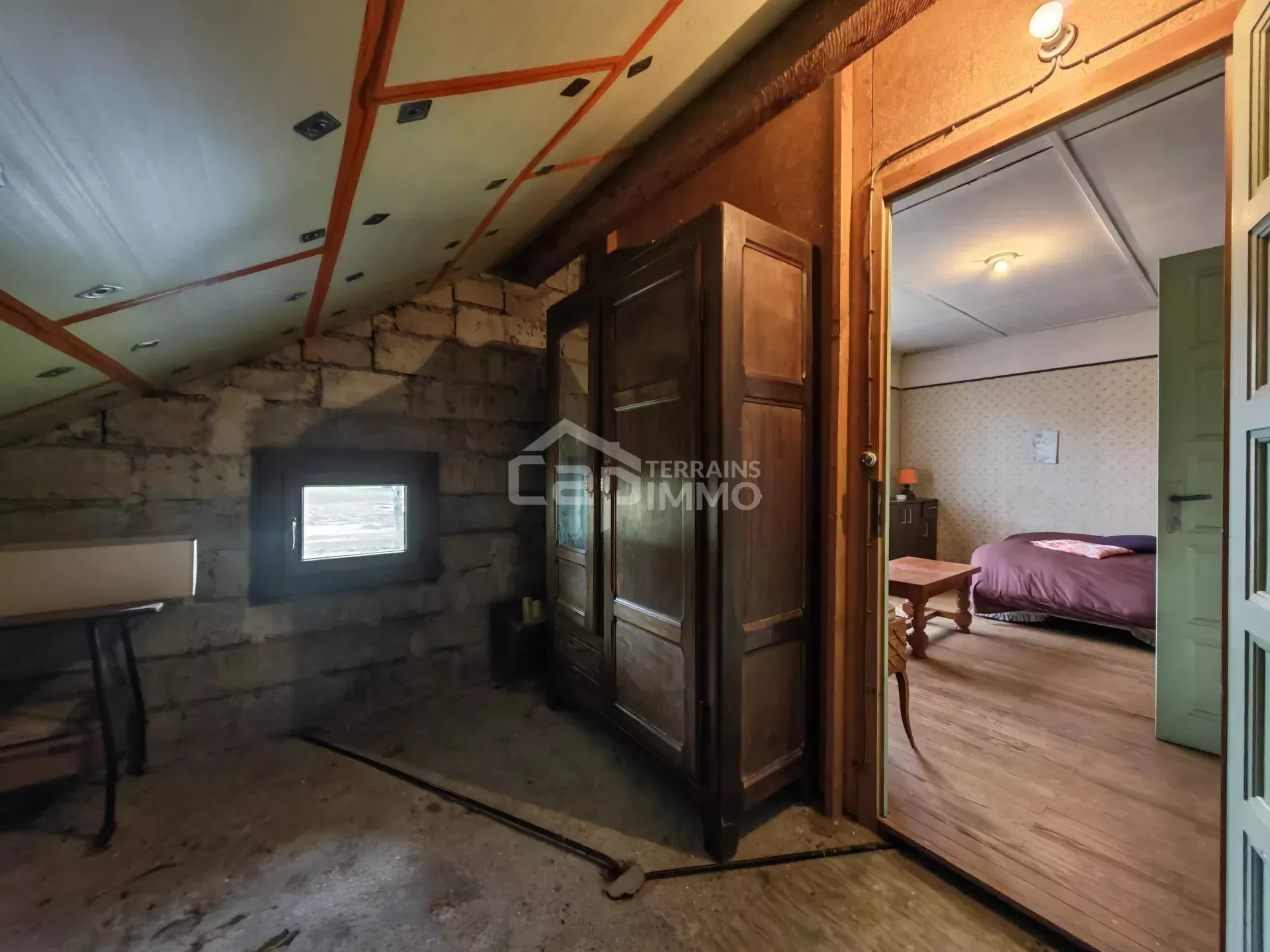 - À l'étage en combles : Palier/dégagement, deux chambres avec grands rangements mansardés (possibilité dressings), et un grand grenier aménageable de 26,58m² sur dalle brute permettant la création de deux pièces supplémentaires.