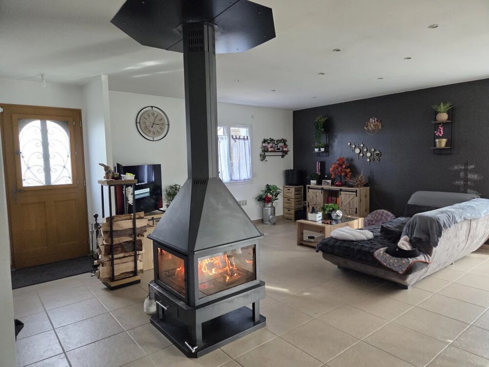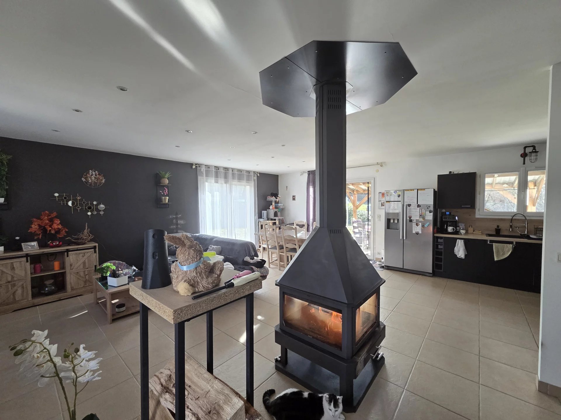 Maison de plain-pied : grande pièce de vie lumineuse, agrémentée d'un poêle à bois avec un accès direct à la terrasse.