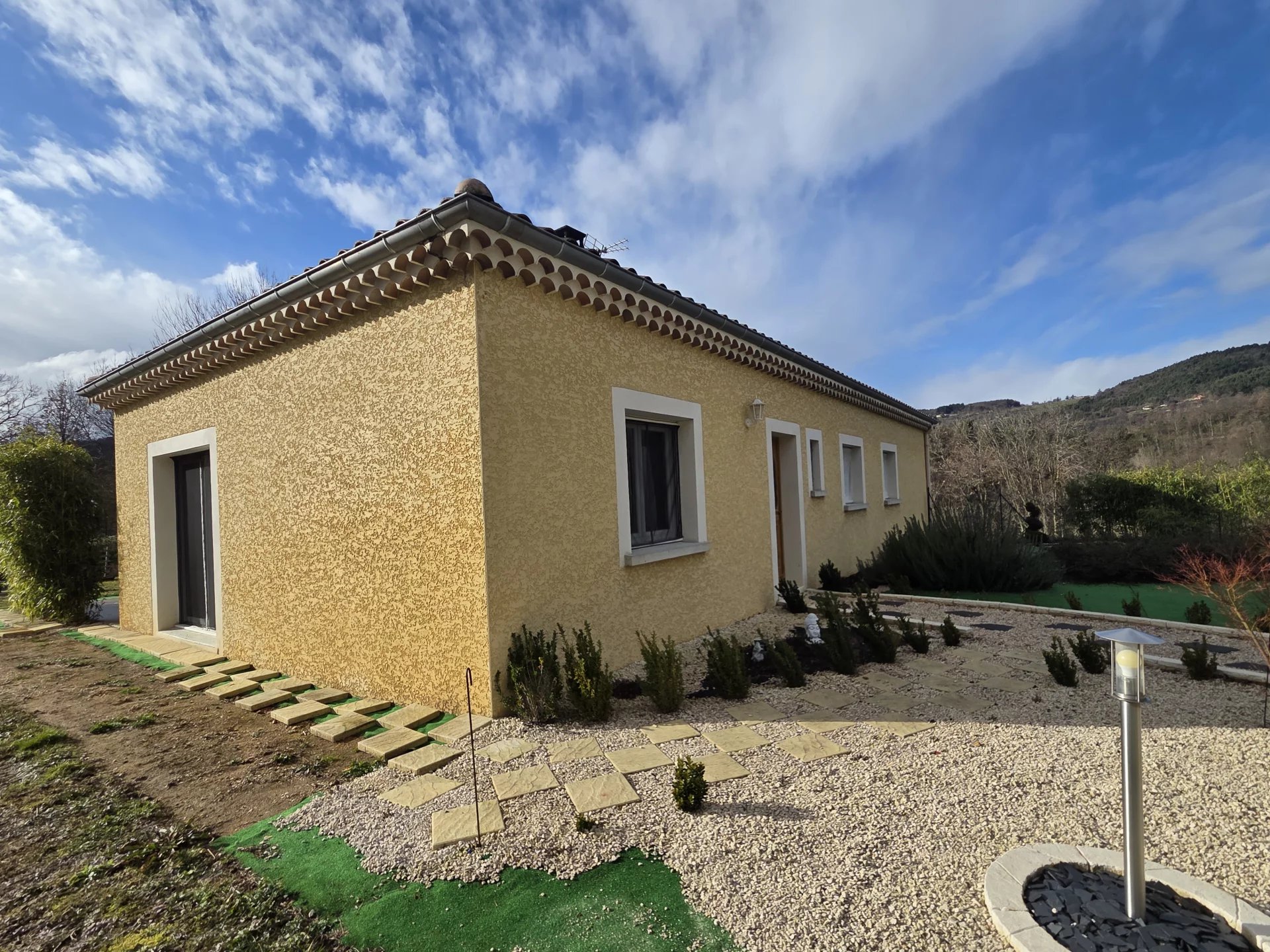 Située dans un charmant village à proximité de Lamastre et de Tournon-sur-Rhône, cette villa construite en 2010 offre un cadre de vie agréable et calme, de beaux volumes et une belle vue dégagée.Elle vous propose :