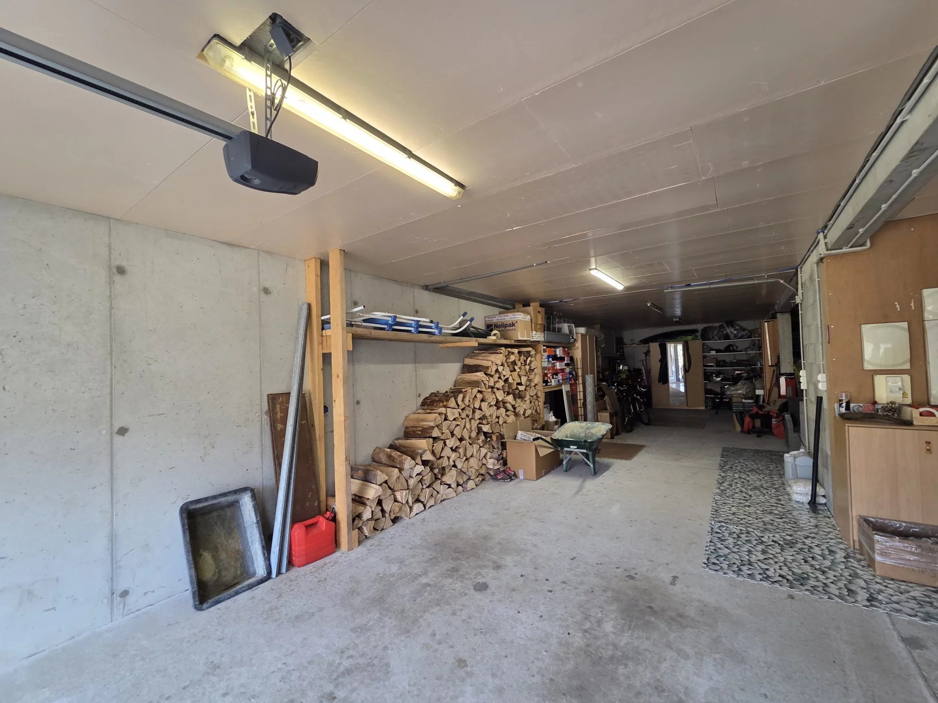 Sous-sol comprenant un garage avec porte motorisée, ainsi qu'un espace buanderie et WC.