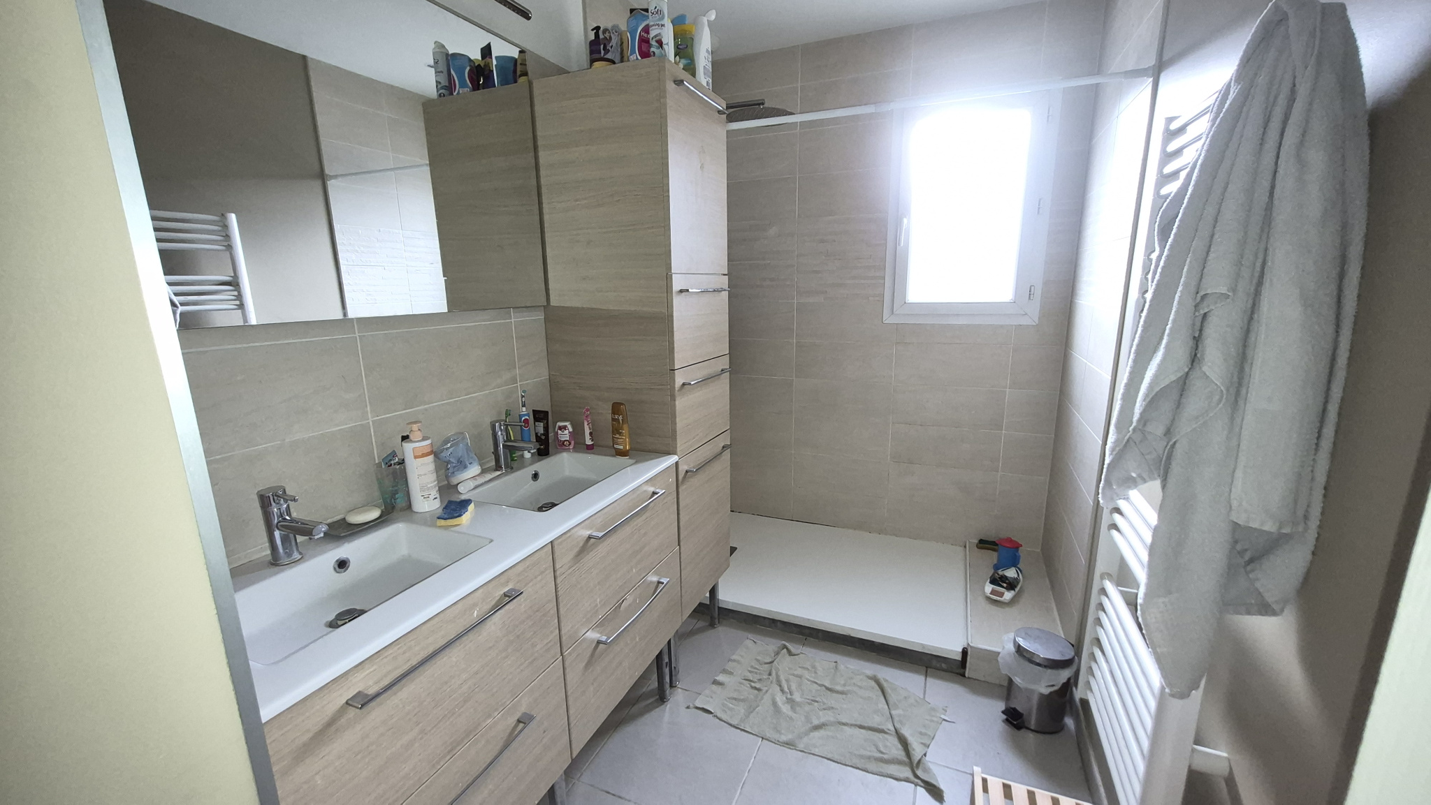 Côté sanitaire, vous disposerez d'une salle d'eau contemporaine équipée d'une douche avec bac extra-plat et d'une double vasque, alliant confort et esthétisme.