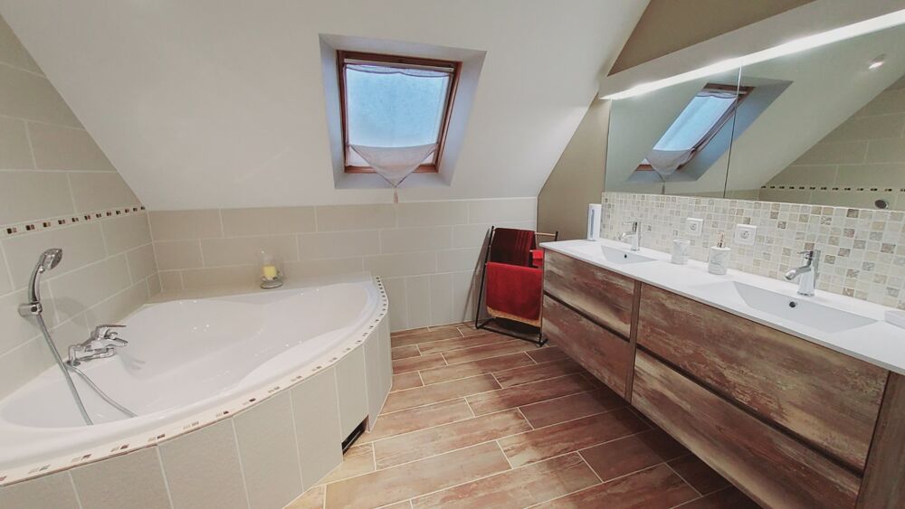Au rez-de-chaussée, vous profiterez d'une pièce de vie de 60m² lumineuse et chaleureuse grâce à un puits de lumière et son poêle à bois, ouverte sur une cuisine aménagée et équipée, ainsi qu'une suite parentale avec salle d'eau et un WC.
