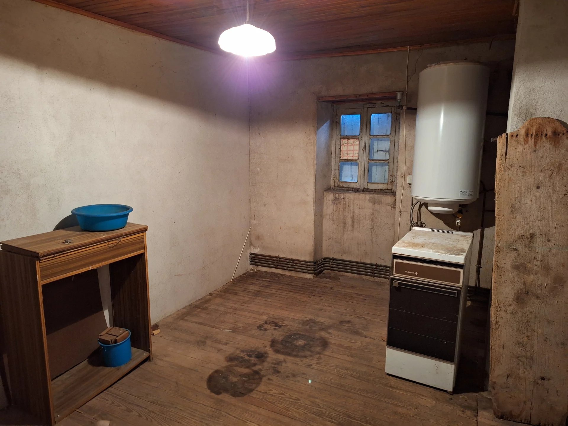 Rez-de-Chaussée : entrée / cuisine et placard, salle d'eau, chambre, deux caves voutées, w.c