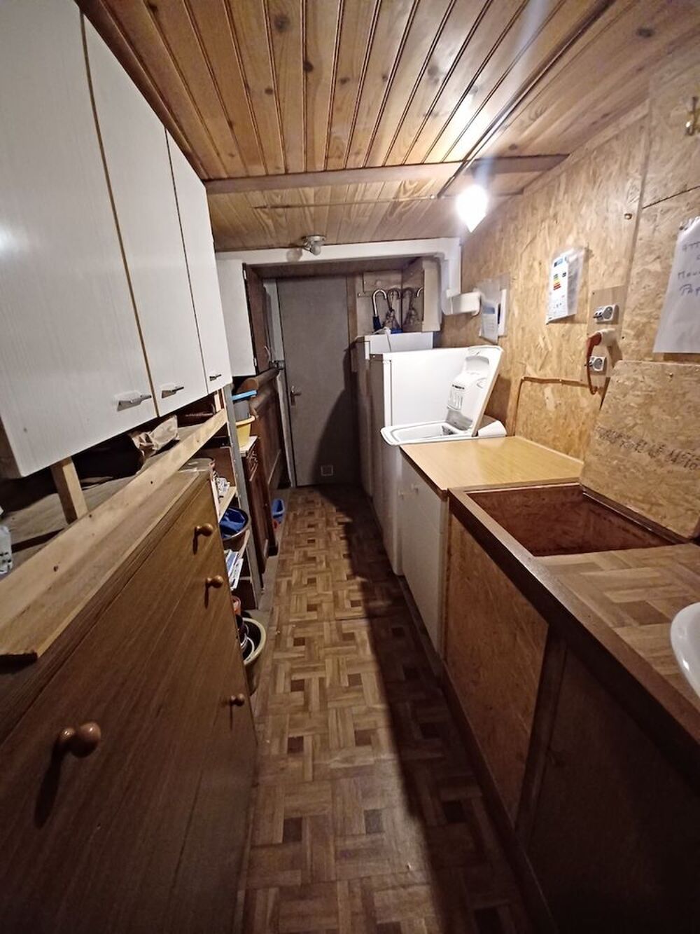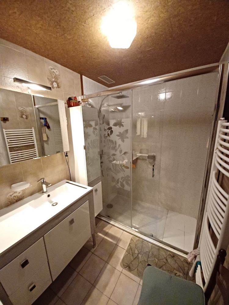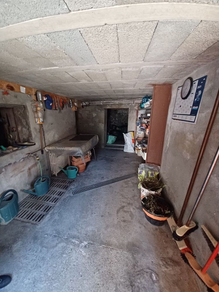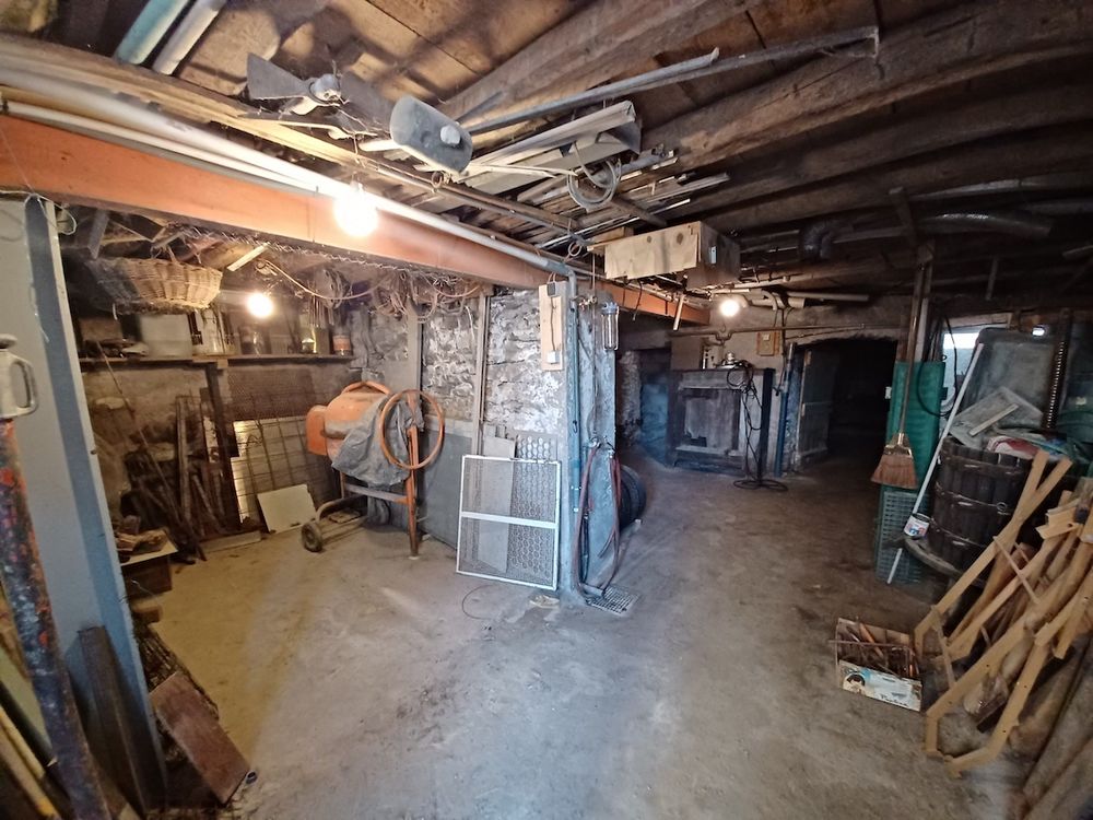 Les sanitaires se composent d'une salle de douche équipée et de deux WC, un à chaque niveau. Au 1er rez-de-chaussée inférieur, accessible depuis l'intérieur de la maison ainsi que par l'extérieur, se trouvent un petit garage, deux vastes ateliers, une buanderie, un local technique et de nouveau des sanitaires.