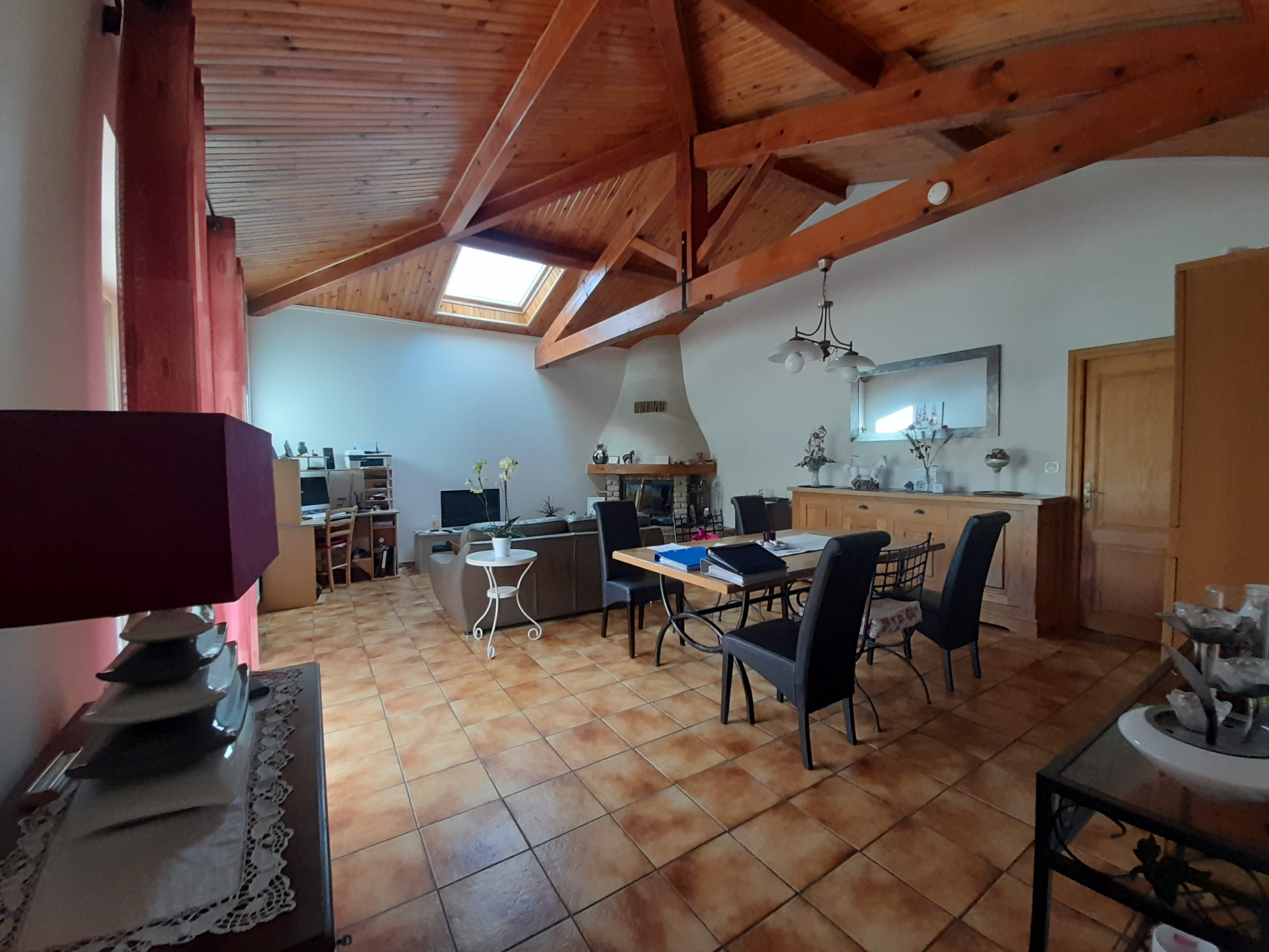 Grande cuisine familiale équipée, salon-séjour lumineux avec cheminée foyer fermé