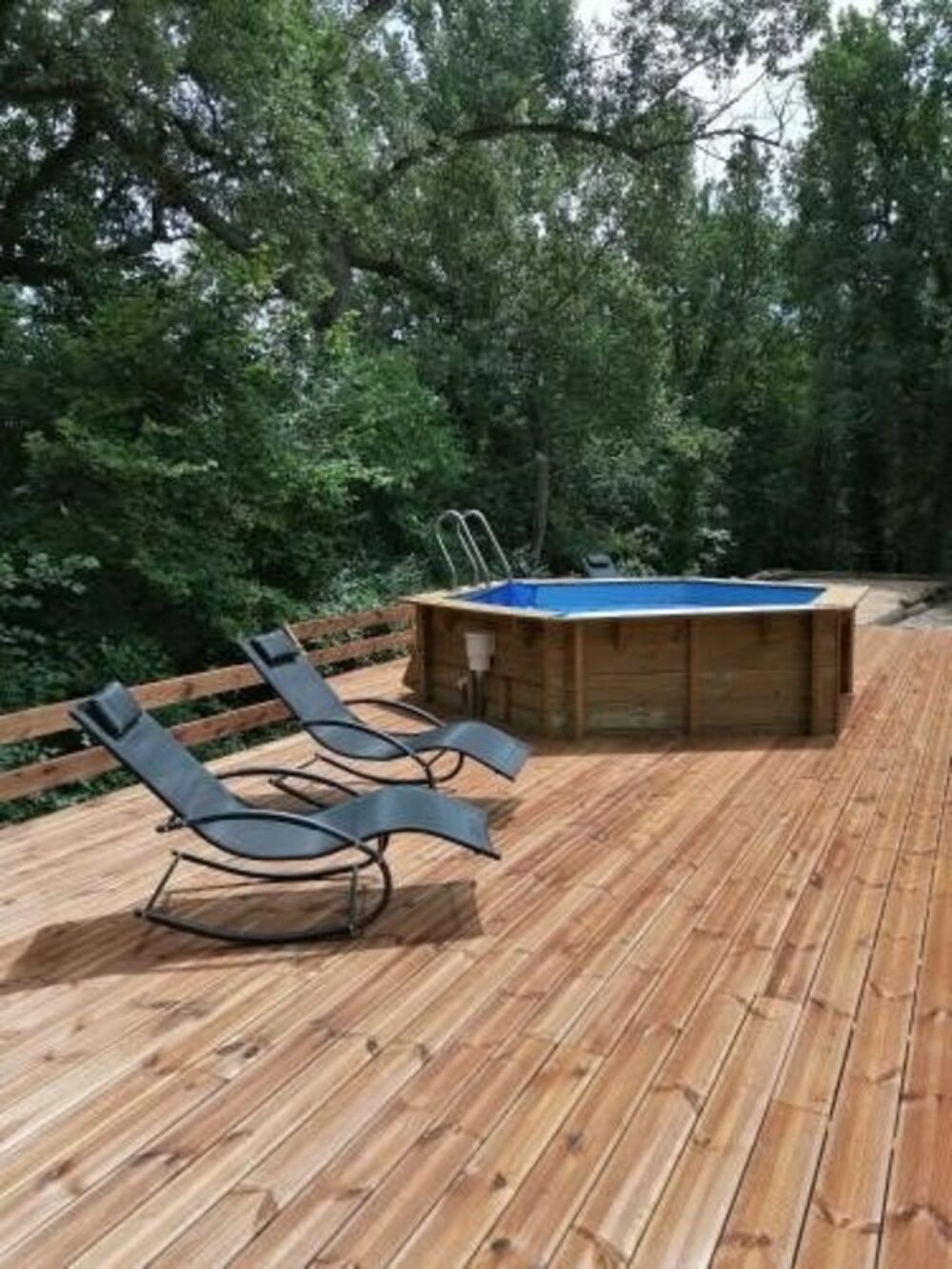 En rez-de-jardin, trois garages d'environ 30 m² chacun s'ajoutent à une cuisine d'été donnant accès à une terrasse en bois intégrant une piscine hors-sol semi-enterrée et un espace dédié au jeu de boules.