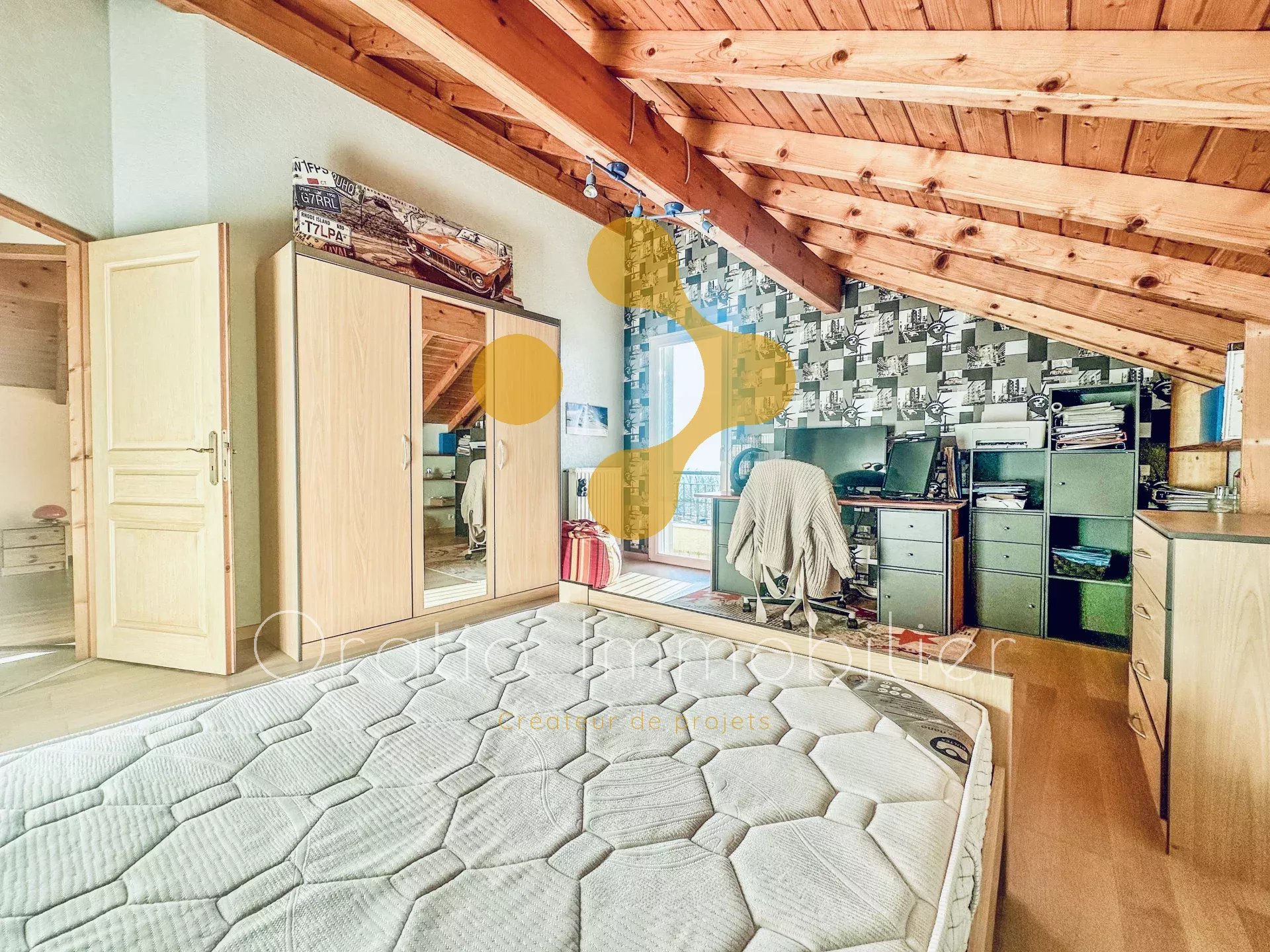 À l'étage, 3 belles chambres mansardées de 16, 18 et 21m2 au sol, une grande salle de bains et une buanderie.