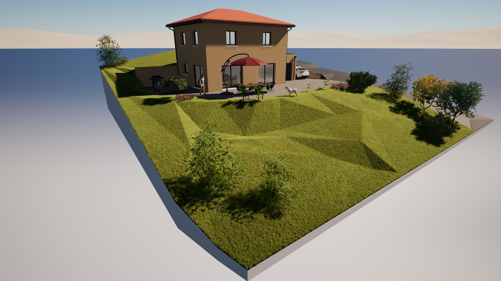 Matériaux et finitions de qualité. Chauffage au sol par pompe à chaleur, carrelage 90 X90, baies aluminium, garde corps aluminium et soubassement vitré...