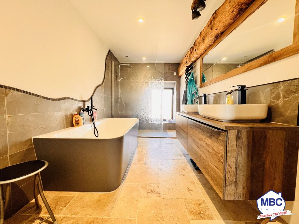 - A l'étage : Mezzanine avec parquet en chêne (12.06 m²), chambre (16.65 m²), grenier, et suite parentale salle d'eau et dressing (32.9 m²).