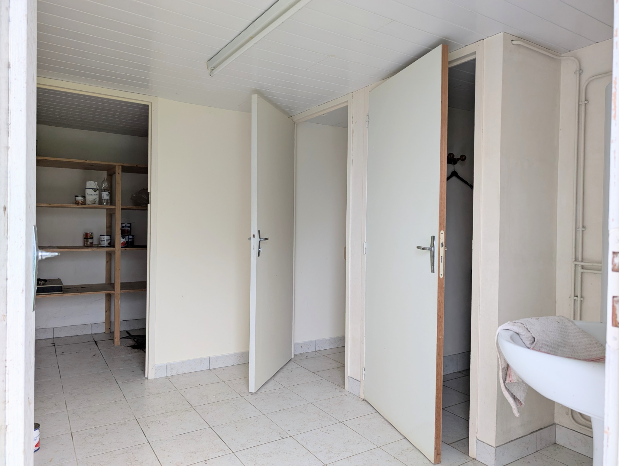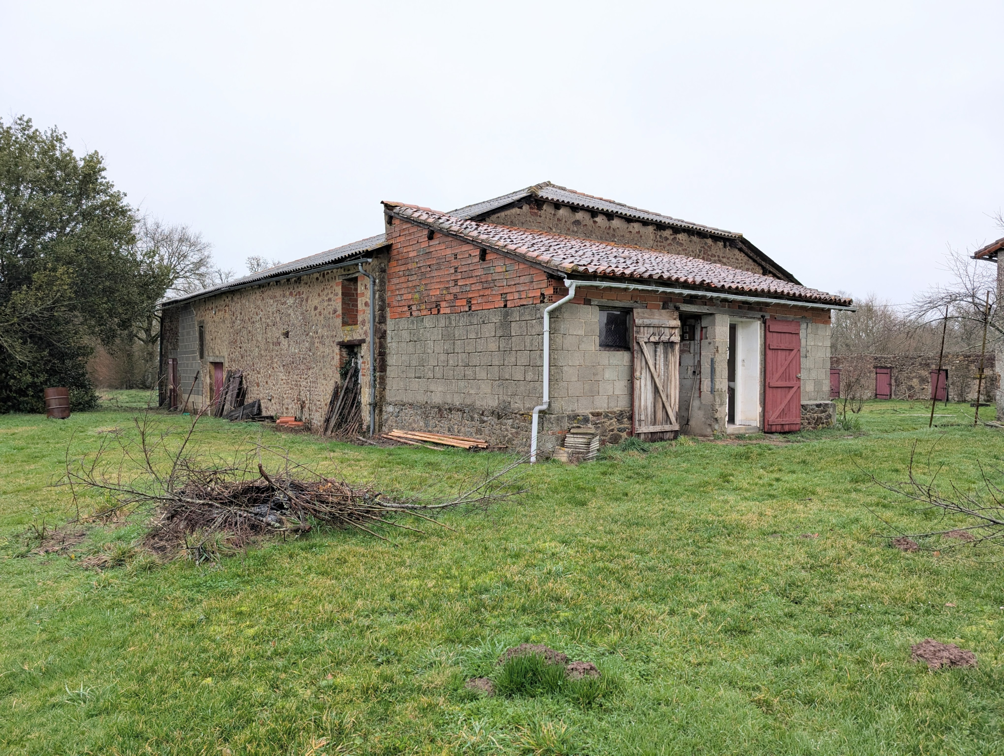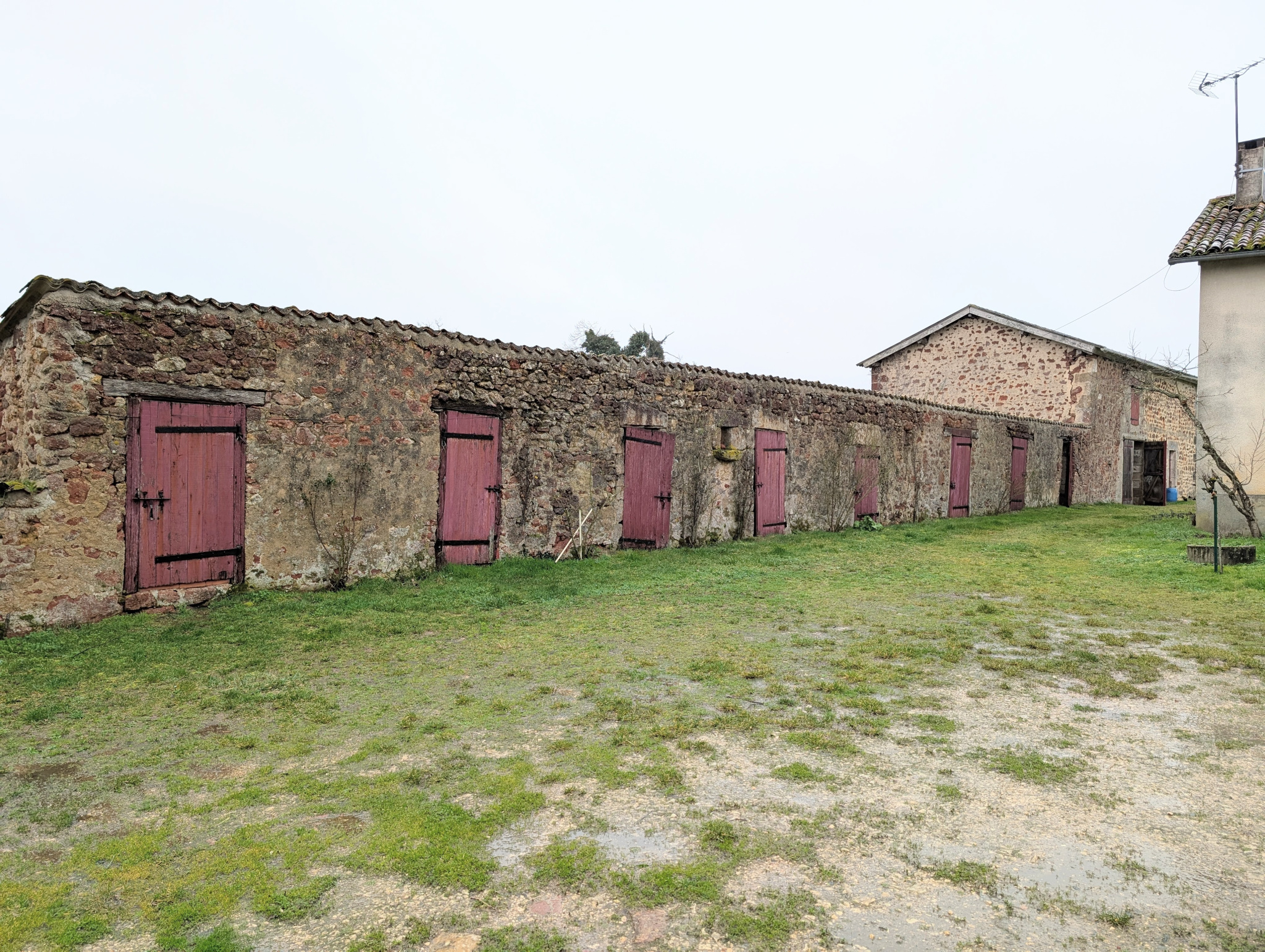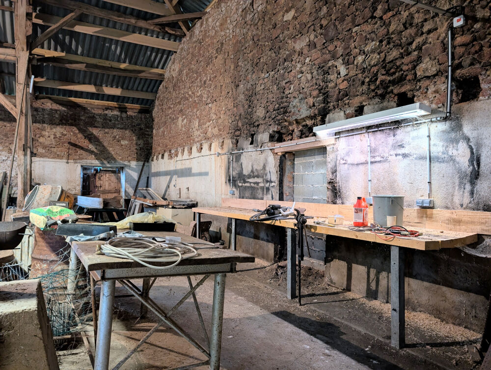 Toits à cochons attenants; Grange indépendante d'environ 300 m2 (toiture fibro-ciment). Sanitaires extérieurs de 17 m2 avec remise, douche et WC, Cellier de 20 m2