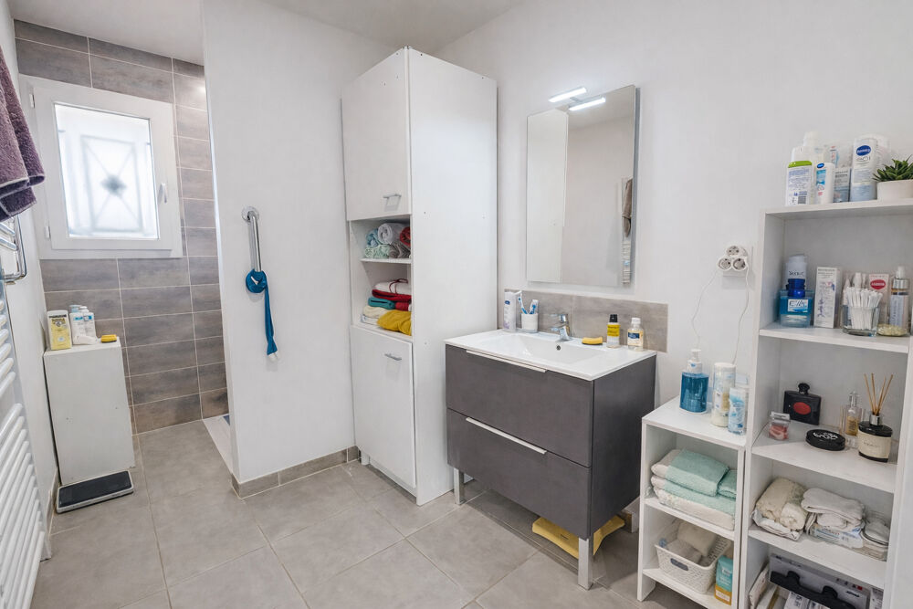 Un cellier-buanderie avec chauffe-eau thermodynamique vient compléter cet espace.La partie nuit se compose de quatre chambres, d'une salle d'eau, d'un WC indépendant ainsi que d'un garage de 17 m².