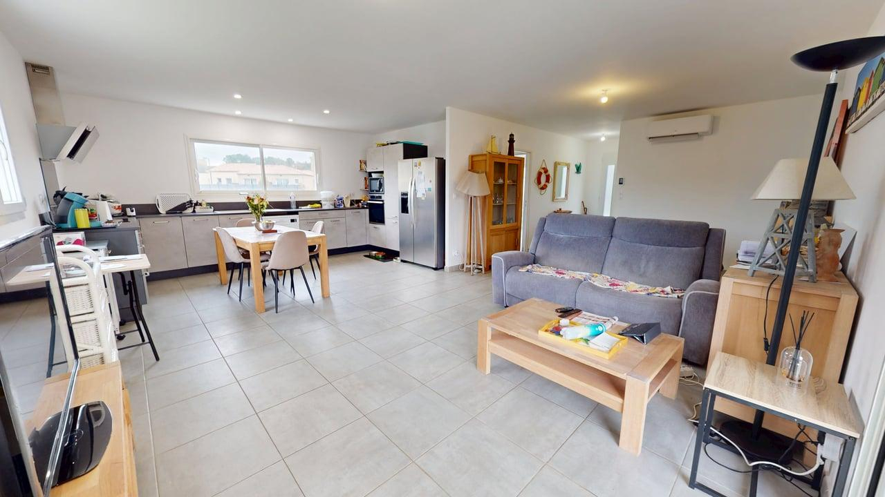 En exclusivité à Villedubert, dans un environnement calme et agréable, découvrez cette maison 4 faces construite en 2021 selon la norme RT 2012, offrant environ 108 m² habitables sur une parcelle de 700 m².Dès l'entrée, la maison séduit par sa distribution fonctionnelle et sa luminosité.La pièce de vie accueille un séjour ouvert sur une cuisine aménagée et équipée, créant un espace convivial parfaitement adapté à la vie quotidienne.